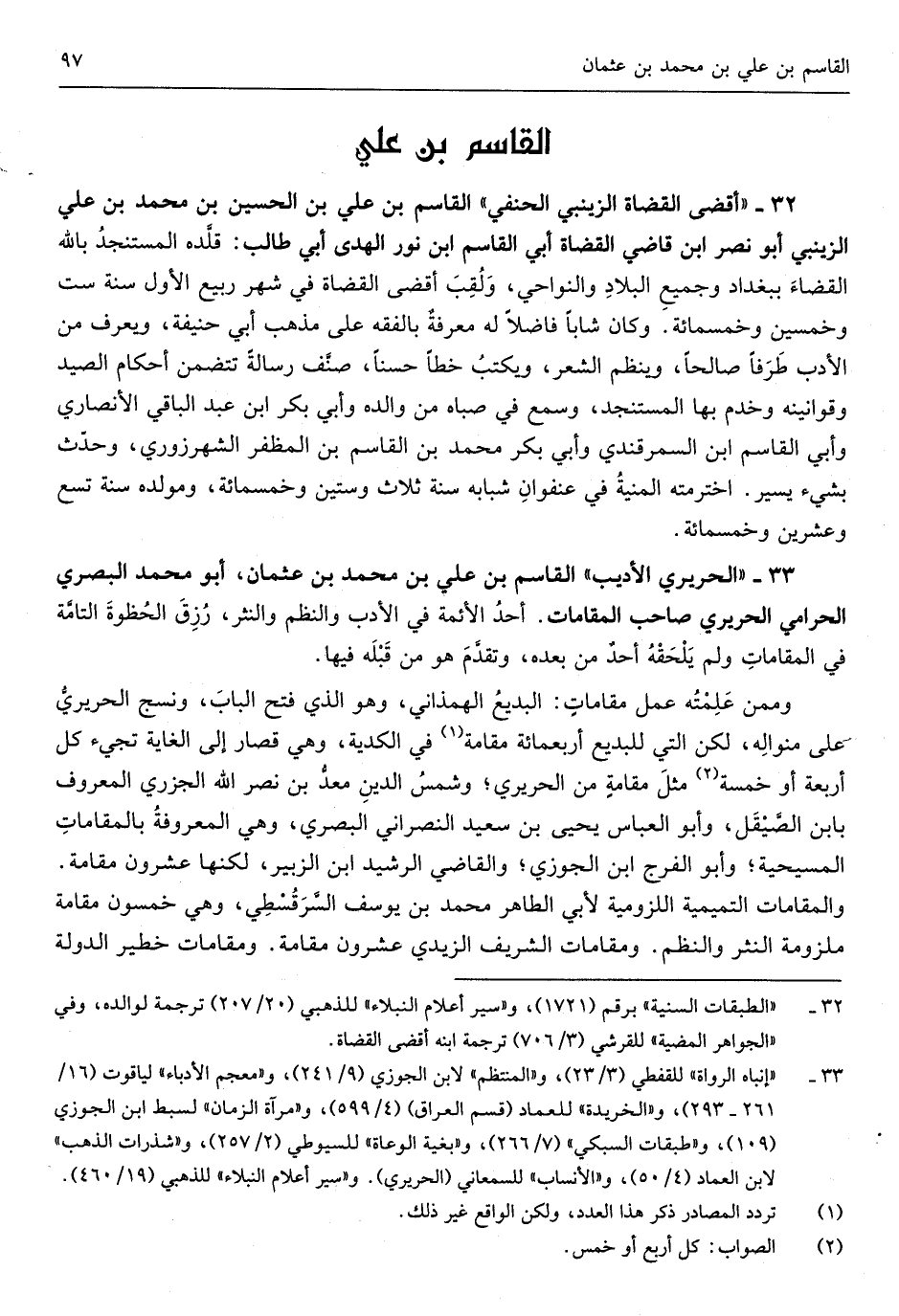 الحريري الأديب الْقَاسِم بن عَليّ بن مُحَمَّد بن عُثْمَان أَبُو مُحَمَّد الْبَصْرِيّ الحرامي الحريري صَاحب القمامات أحد الْأَئِمَّة فِي الْأَدَب وَالنّظم والنثر رزق الحظوة التَّامَّة فِي المقامات وَلم يلْحقهُ أحد من بعده وَتقدم هُوَ من قبله فِيهَا