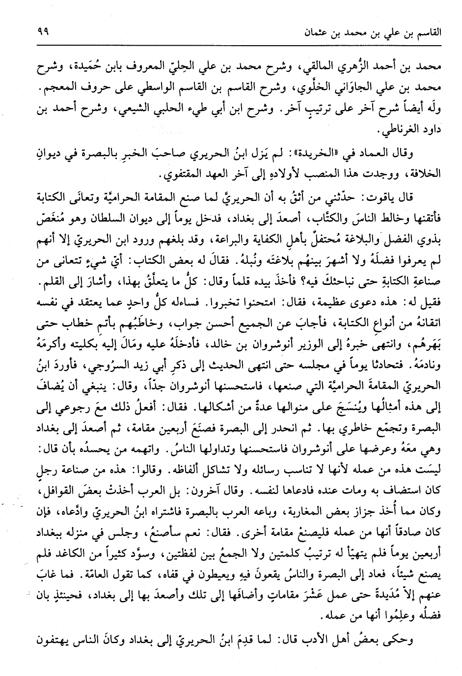 قَالَ ياقوت حَدثنِي من أَثِق بِهِ أَن الحريري لما صنع المقامة الحرامية وتعانى الْكِتَابَة فأتقنها وخالط النَّاس وَالْكتاب أصعد إِلَى بَغْدَاد فَدخل يَوْمًا إِلَى ديوَان السُّلْطَان وَهُوَ منغص بذوي الْفضل والبلاغة محتفل بِأَهْل الْكِفَايَة والبراعة وَقد بَلغهُمْ وُرُود ابْن الحريري إِلَّا أَنهم لم يعرفوا فضلله وَلَا أشهر بَينهم بلاغته ونبله