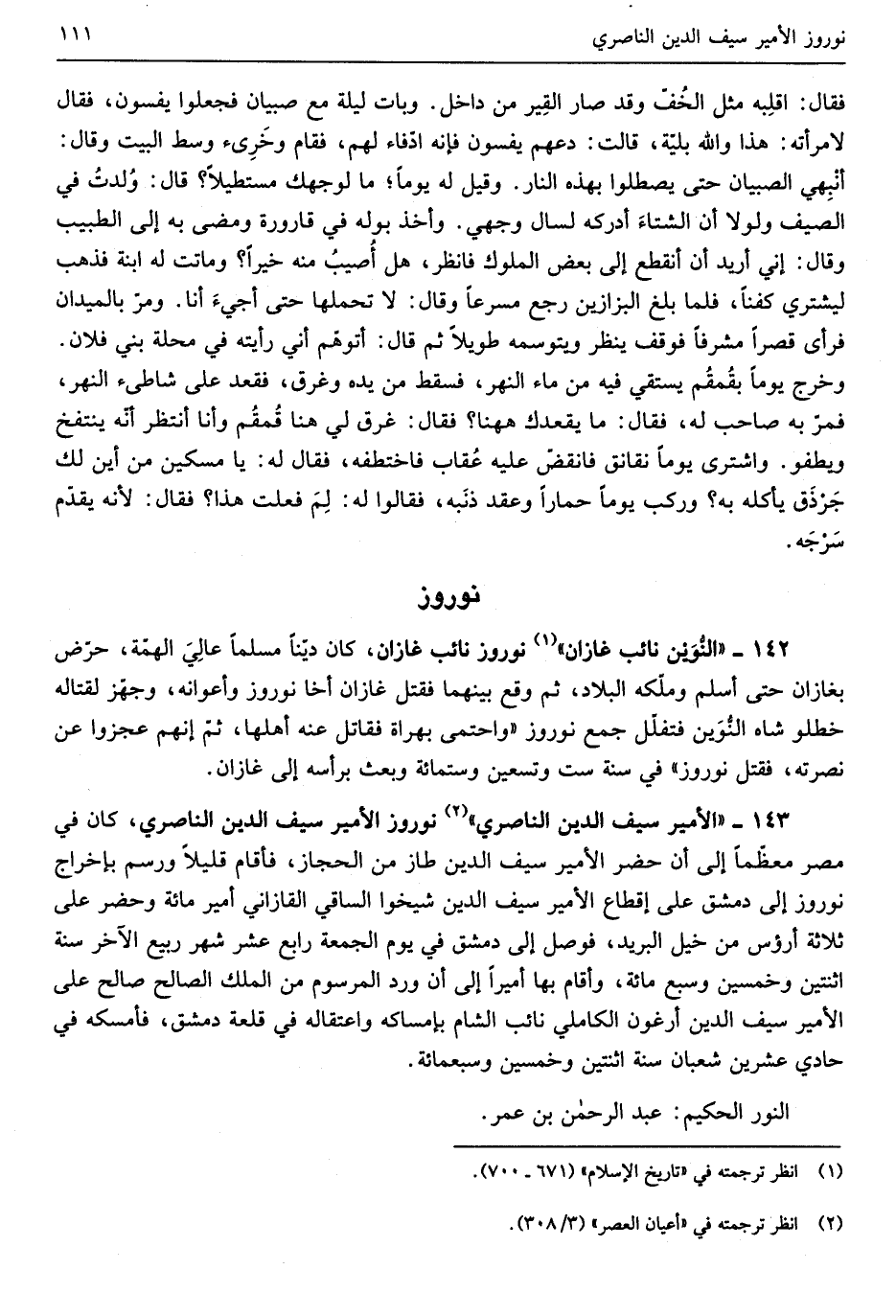 نوروز الْأَمِير سيف الدّين الناصري كَانَ فِي مصر مُعظما إِلَى أَن حضر الْأَمِير سيف الدّين طاز من الْحجاز فَأَقَامَ قَلِيلا ورسم بِإِخْرَاج نوروز إِلَى دمشق على إقطاع الْأَمِير سيف الدّين شيخوا الساقي القازاني أَمِير مائَة وَحضر على ثَلَاثَة أرؤس من خيل الْبَرِيد فوصل إِلَى دمشق فِي يَوْم الْجُمُعَة رَابِع عشر شهر ربيع الآخر سنة اثْنَتَيْنِ وَخمسين وَسبع مائَة وَأقَام بهَا أَمِيرا إِلَى أَن ورد المرسوم من الْملك الصَّالح صَالح على الْأَمِير سيف الدّين أرغون الكاملي نَائِب الشَّام بإمساكه واعتقاله فِي قلعة دمشق فأمسكه فِي حادي عشْرين شعْبَان سنة اثْنَتَيْنِ وَخمسين وَسَبْعمائة