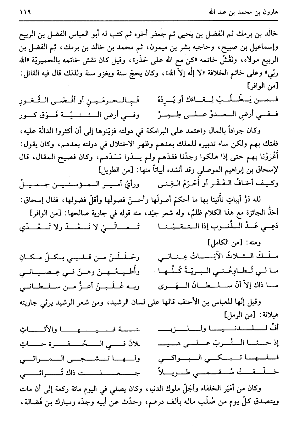 وَكَانَ جواداً بِالْمَالِ وَاعْتمد على البرامكة فِي دولته فزينوها إِلَى أأكثروا الدالّة عَلَيْهِ ففتك بهم وَلَكِن سَاءَ تَدْبيره للْملك بعدهمْ وَظهر الاختلال فِي دولته بعدهمْ وَكَانَ يَقُول أَغرونا بهم حَتَّى إِذا هَلَكُوا وجدنَا فقدَهم وَلم يسدّوا مَسَدّهم وَكَانَ فصيح الْمقَال قَالَ لإسحاق بن إِبْرَاهِيم الْموصِلِي وَقد أنْشدهُ أبياتاً مِنْهَا