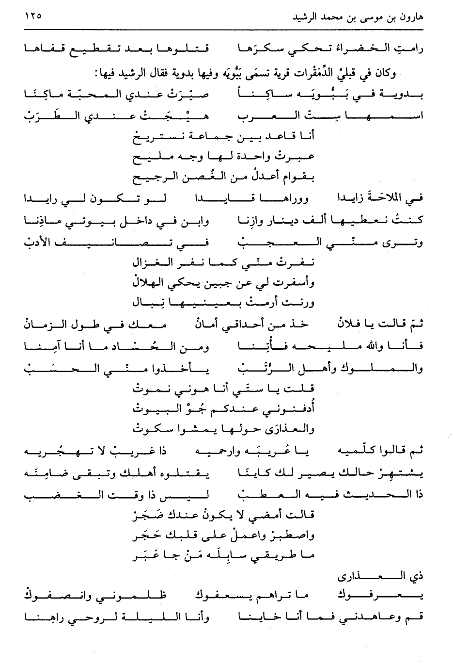 نفرت مني كَمَا نفر الغزال واسفرت لي عَن جبين يَحْكِي الْهلَال ورنت أرمت بِعَينهَا نِبال ثمَّ قَالَت يَا فلانخذ من أحداقي أمانمعك فِي طول الزَّمَان