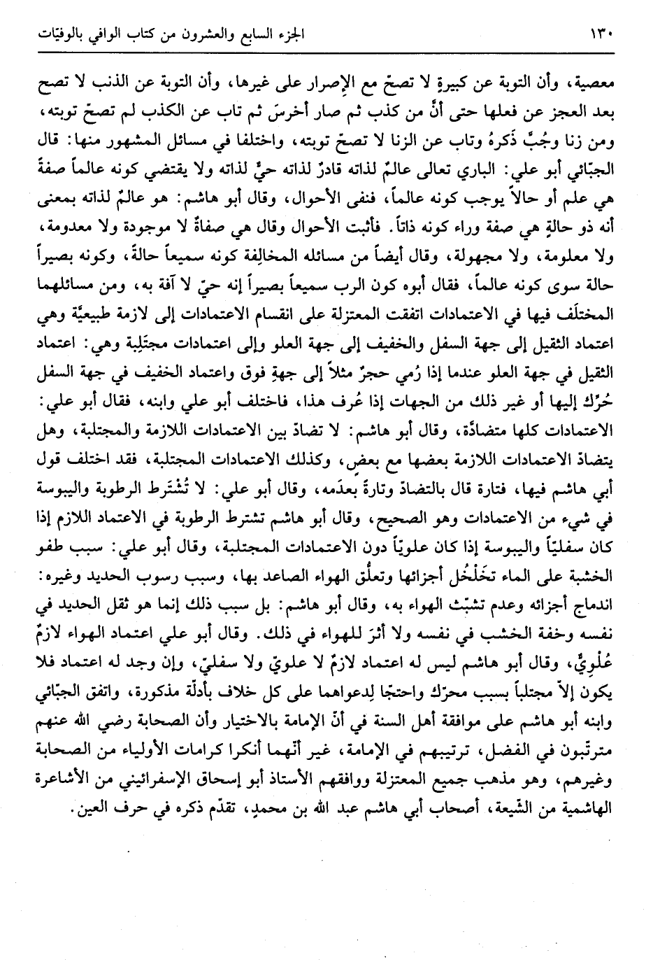 مَعْصِيّة وَأَن التَّوْبَة عَن كبيرةٍ لَا تصحّ مَعَ الْإِصْرَار على غَيرهَا وَأَن التَّوْبَة عَن الذَّنب لَا تصح بعد الْعَجز عَن فعلهَا حَتَّى أنَّ من كذب ثمَّ صَار أخرسَ ثمَّ تَابَ عَن الْكَذِب لم تصح تَوْبَته وَمن زنا وجُبَّ ذكرَهُ وَتَابَ عَن الزِّنَا لَا تصحّ تَوْبَته وَاخْتلفَا فِي مسَائِل الْمَشْهُور مِنْهَا قَالَ الجبّائي أَبُو عَليّ الْبَارِي تَعَالَى عالمٌ لذاته قادرٌ لذاته وَلَا يَقْتَضِي كَونه عَالما صفة هِيَ علم أَو حَالا يُوجب كَونه عَالما فنفى الْأَحْوَال وَقَالَ أَبُو هَاشم هُوَ عالمٌ لذاته بِمَعْنى أَنه ذُو حالةٍ وَهِي صفة وَرَاء كَونه ذاتاً فَأثْبت الْأَحْوَال وَقَالَ هِيَ صفاةٌ لَا مَوْجُودَة وَلَا مَعْدُومَة وَلَا مَعْلُومَة وَلَا مَجْهُولَة وَقَالَ أَيْضا من مسَائِله المخالِفة كَونه سميعاً حَالَة وَكَونه بَصيرًا حَالَة سوى كَونه عَالما فَقَالَ أَبوهُ كَون الرب سميعاً بَصيرًا إِنَّه حيّ لَا آفةَ بِهِ وَمن مسائلهما المختلَف فِيهَا فِي الاعتمادات اتّفقت الْمُعْتَزلَة على انقسام الاعتمادات إِلَى لَازِمَة طبيعيَّة وَهِي اعْتِمَاد الثقيل إِلَى جِهَة السّفل والخفيف إِلَى جِهَة الْعُلُوّ وَإِلَى اعتمادات مجتَلِية وَهِي إعتماد الثقيل فِي جِهَة الْعُلُوّ عِنْدَمَا إِذا رُمى حجرٌ مثلا إِلَى جهةِ فَوق واعتماد الْخَفِيف فِي جِهَة السّفل حُرِّك إِلَيْهَا أَو غير ذَلِك من الْجِهَات إِذا عُرف)