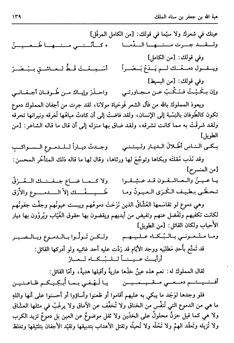 وَهِي دموع لَو تقاسَمها العُشَّاقُ الَّذين نَزَحَت دموعُهم ويبِست عيونُهم وجفَّت جفونُهم لكَانَتْ تكفيهم وتَفضل عَنْهُم وَتفِيض من أَيْديهم ويقضون بهَا حُقُوق الغُيّاب ويُروُون بهَا ديار الأحباب ولكان الْقَائِل