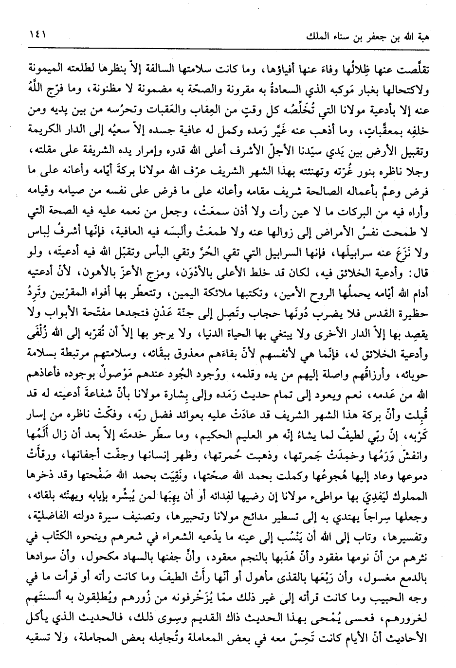 تقلَّصت عَنْهَا ظِلالُها وفاءَ أفياؤها وَمَا كَانَت سلامتها السالفة إِلَّا بنظرها لطلعته الميمونة ولاكتحالها بغبار مَوكبه الَّذِي السعادةُ بِهِ مقرونة والصحّة بِهِ مَضْمُونَة لَا مظنونة وَمَا فرج الله عَنهُ إِلَّا بأدعية مَوْلَانَا الَّتِي تُخلِّصُه كل وقتٍ من العِقابي والعقبَات وتحرُسه من بَين يَدَيْهِ وَمن خلفِه بمعقَّباتٍ وَمَا أذهب عَنهُ غَيَّر رَمده وكمل لَهُ عَافِيَة جسده إِلَّا سعيُه إِلَى الدَّار الْكَرِيمَة وتقبيل الأَرْض بَين يديَ سيّدنا الأجلّ الْأَشْرَف أَعلَى الله قدره وإمرار يَده الشَّرِيفَة على مقلته وجلا ناظره بِنور غُرته وتهنئته بِهَذَا الشَّهْر الشريف عرف الله مَوْلَانَا بركةَ أَيَّامه وأعانه على مَا فرض على نَفسه من صِيَامه وقيامه وَأرَاهُ فِيهِ من البركات مَا لَا عين رَأَتْ وَلَا أذن سَمِعت وَجعل من نعْمَة عَلَيْهِ فِيهِ الصِّحَّة الَّتِي لَا طمحت نفسُ الْأَمْرَاض إِلَى زَوَالهَا عَنهُ وَلَا طمعت وألبسَه فِيهِ الْعَافِيَة فَإِنَّهَا أشرف لِباس وَلَا نَزَعَ عَنهُ سرابيلَها فَإِنَّهَا الَّتِي تَقِيّ الحُرَّ وتقي الْبَأْس وَتقبل الله فِيهِ أدعيتُه وَلَو قَالَ وأدعية الْخَلَائق فِيهِ لَكَانَ قد خلط الْأَعْلَى بالأدوَن ومزج الْأَعَز بالأهون لِأَن أدعيته أدام الله أَيَّامه يحملُها الرّوح الْأمين وتكتبها مَلَائِكَة الْيَمين وتتعطر بهَا أَفْوَاه المقربين وتَرِدُ حَظِيرَة الْقُدس فَلَا يضْرب دُونَها حجاب وتَصِل إِلَى جنَّة عَدنٍ فتجدها مفتحة الْأَبْوَاب وَلَا يقصِد بهَا الدَّار الْأُخْرَى وَلَا يَبْتَغِي بهَا الْحَيَاة الدُّنْيَا وَلَا يَرْجُو بهَا إلاّ أَن تقربّبه إِلَى الله زُلفَى وأدعية الْخَلَائق لَهُ فَإِنَّمَا هِيَ لأَنْفُسِهِمْ لأنّ بقاءَهم معذوق بِبَقَائِهِ وسلامتهم مرتبطة بسلامة حوبائه وأرزاقُهم واصلة إِلَيْهِم من نعَم وَيعود إِلَى تَمام حَدِيث رَمَده وَإِلَى بِشارة مَوْلَانَا بأنّ شفاعةَ أدعيته لَهُ قد قُبِلت وأنّ بركَة هَذَا الشريف قد عَادَتْ عَلَيْهِ بعوائد فضل ربه وفكّتْ ناظره من إسار كَربه إنّ رَبِّي لطيفٌ لما يشاءُ إِنَّه هُوَ الْعَلِيم الْحَكِيم وَمَا سطر خدمتَه إِلَّا بعد أَن زَالَ أَلَمُها وانفش وَرَمها وخمِدَت جَمرتها وَذَهَبت حُمرتها وَظهر إنسانها وجفت أجفانها ورقأت دموعها وَعَاد إِلَيْهَا هُجوعُها وكملت بِحَمْد الله صِحَّتهَا ونَقِيت بِحَمْد الله صَفحتها وَقد ذخرها الْمَمْلُوك ليَفديَ بهَا مواطىء مَوْلَانَا إِن رضها لِفدائه أَو أَن يهبَها لمن يُبشِّره بإيابه ويهنئه بلقائه وَجعلهَا سِراجاً يَهْتَدِي بِهِ إِلَى تسطير مدائح مَوْلَانَا وتحبيرها وتصنيف سيرة دولته الْفَاضِلِيَّةِ)