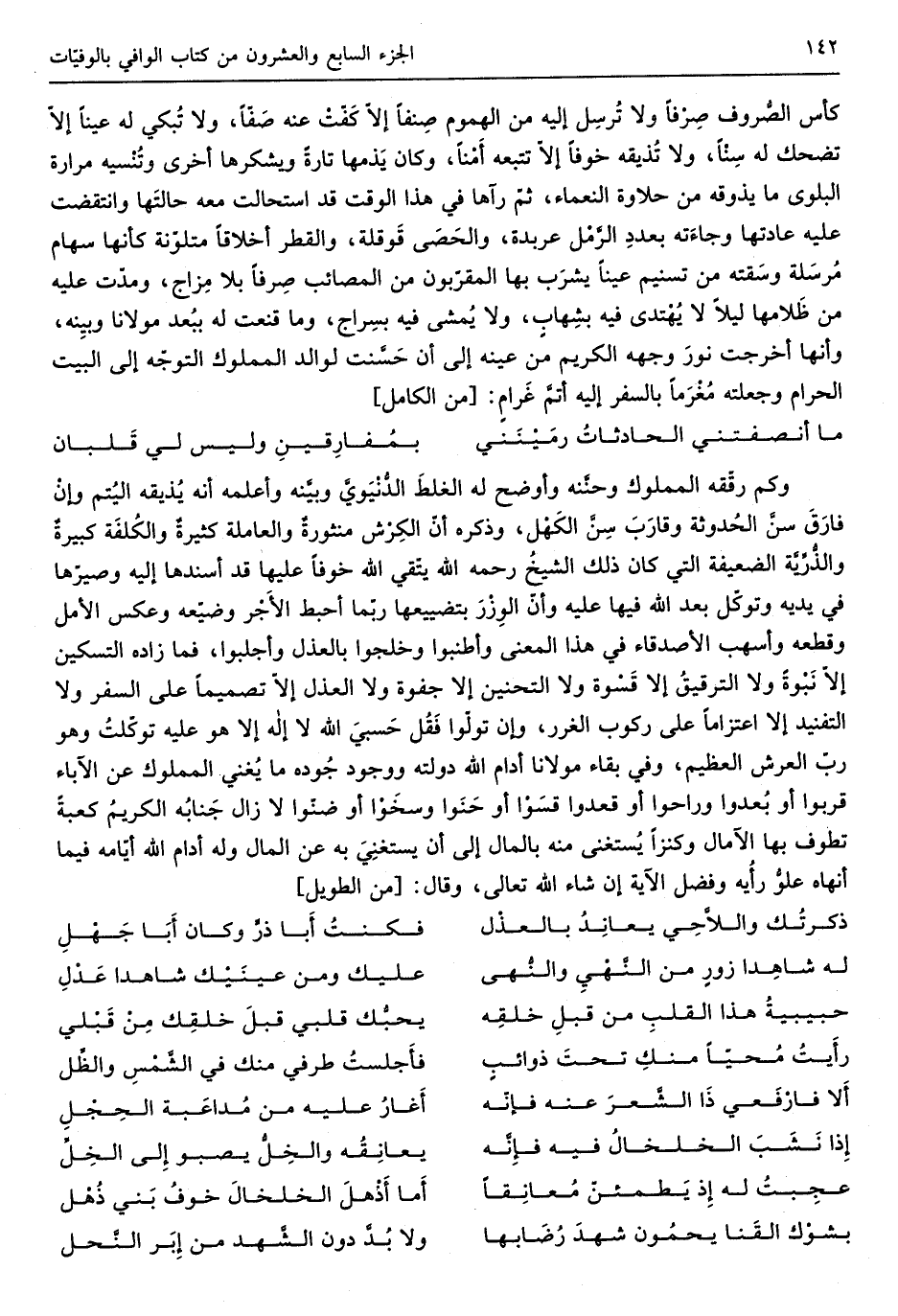 كأس الصُروف صِرفاً وَلَا تُرسِل إِلَيْهِ من الهموم صِنفاً إِلَّا كَفّتْ عَنهُ صَفاً وَلَا تُبكي لَهُ عينا إِلَّا تضحك لَهُ سِناً وَلَا تُذيقه خوفًا إِلَّا تتبعه أَمناً وَكَانَ يَذمها تَارَة ويشكرها أُخْرَى وتُنسيه مرَارَة الْبلوى مَا يذوقه من حلاوة النعماء ثمَّ رَآهَا فِي هَذَا الْوَقْت قد استحالت مَعَه حالتَها وانتقضت عَلَيْهِ عَادَتهَا وجاءَته بعددِ الرَمل عربدة والحصَى قوقلة والقطر أخلافاً متلونة كَأَنَّهَا سِهَام مُرسلة وسَقته من تسنيم عينا يشرَب بهَا المقرّبون من المصائب صِرفاً بِلَا مِزاج ومدّت عَلَيْهِ من ظَلالها لَيْلًا يُهتدى فِيهِ بشِهابٍ وَلَا يُمشى فِيهِ بسِراج وَمَا قنعت لَهُ لوالد الْمَمْلُوك التوجّه إِلَى الْبَيْت الْحَرَام وَجَعَلته مُغرَماً بِالسَّفرِ إِلَيْهِ أتمَّ إِلَيْهِ غَرامٍ