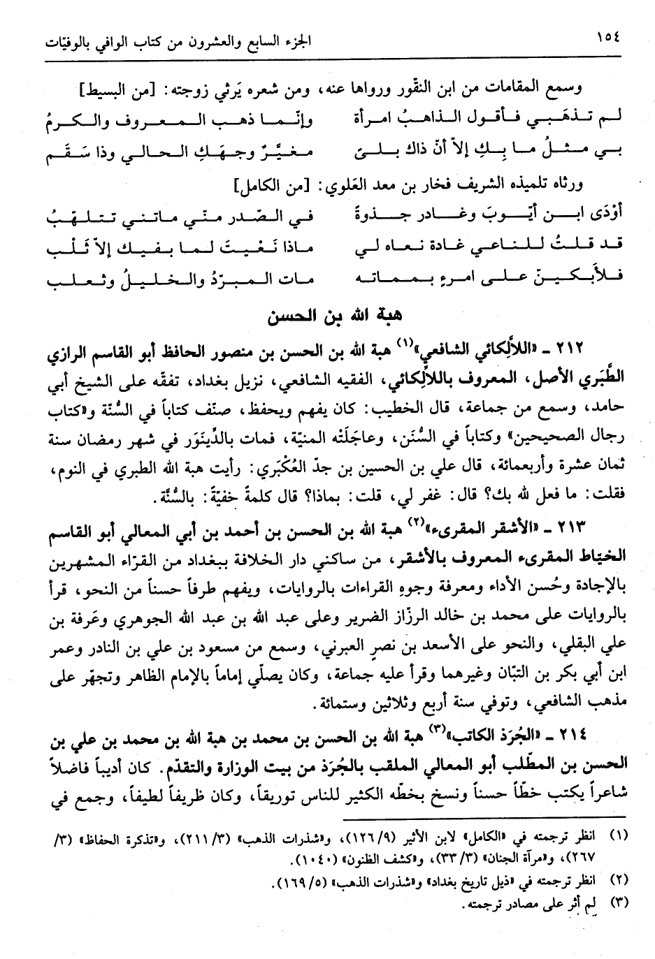 هبة الله بن الْحسن بن مَنْصُور الْحَافِظ أَبُو الْقَاسِم الرَّازِيّ الطَّبَري الأَصْل الْمَعْرُوف باللاَّلِكائي الْفَقِيه الشَّافِعِي نزيل بَغْدَاد تفقه على الشَّيْخ أبي حَامِد وَسمع من جمَاعَة قَالَ الْخَطِيب كَانَ يفهم ويحفظ صنف كتابا فِي السّنة وَكتاب رجال الصَّحِيحَيْنِ وكتاباً فِي السُّنَن وعاجَلَته الْمنية فَمَاتَ بالدَينَوَر فِي شهر رَمَضَان سنة ثَمَان عشرَة أَرْبَعمِائَة قَالَ عَليّ بن الْحُسَيْن بن جدّ العُكبَري رَأَيْت هبة الله الطَّبَرِيّ فِي النّوم فَقلت مَا فعل الله بك قَالَ غفر لي قلت بِمَاذَا قَالَ كلمة خُفْيَة بالسُّنَّة