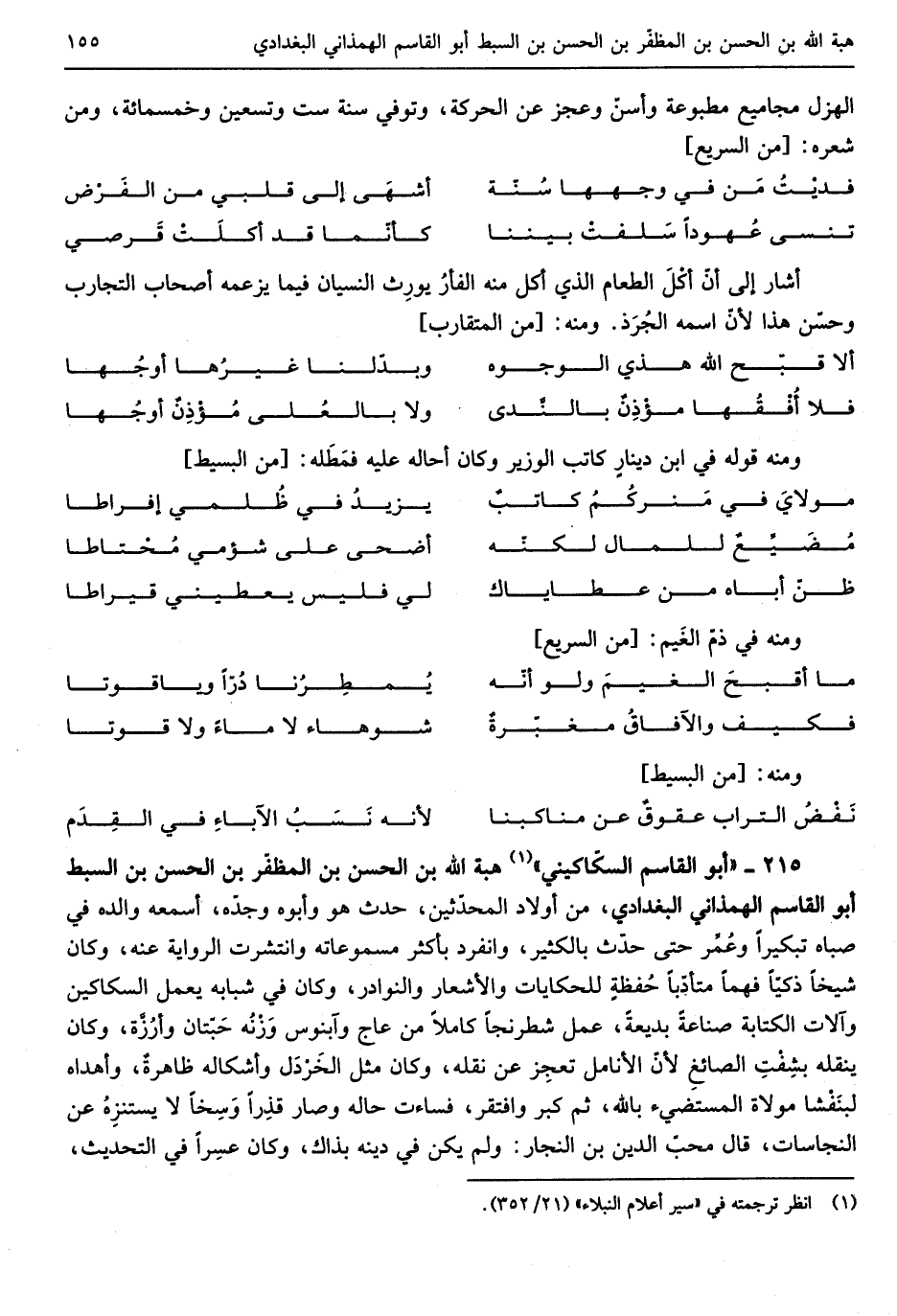 هبة الله بن الْحسن بن المظفر بن الْحسن بن السبط ابو الْقَاسِم الهمذاني البغدادين من أَوْلَاد المحثين حدث هُوَ وَأَبوهُ وجدّه أسمعهُ وَالِده فِي صباه تبكيراً وعُمِّر حَتَّى حدث بالكثير وَانْفَرَدَ بِأَكْثَرَ مسموعاته وانتشرت الرِّوَايَة عَنهُ وَكَانَ شَيخا ذكياً فهما متأدباً حُفظةً للحكايات والأشعار والنوادر وَكَانَ فِي شبابه يعْمل السكاكين وآلات الْكِتَابَة صناعَة بديعةً عمل)