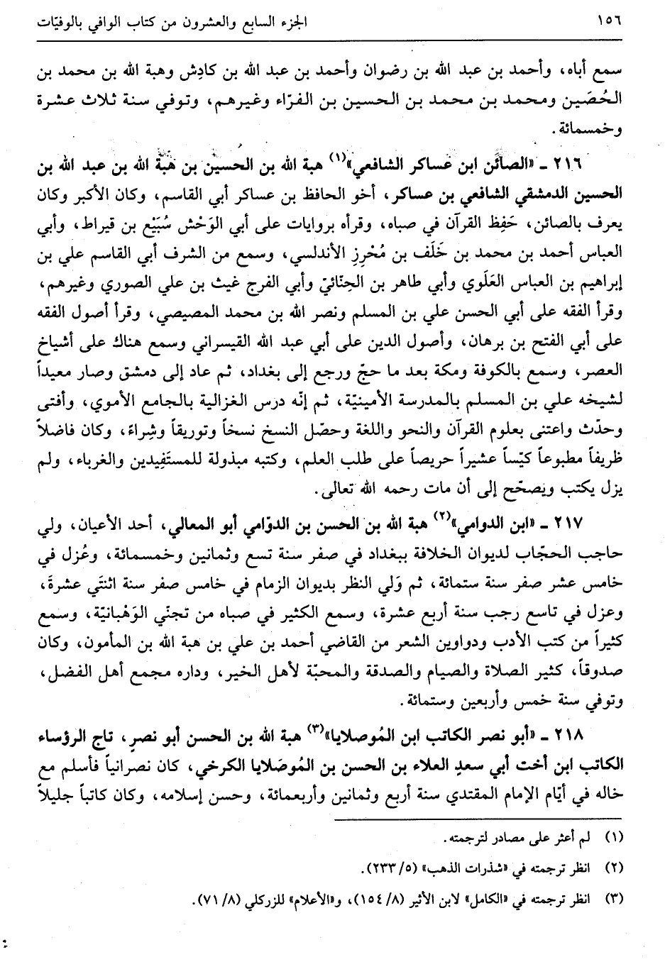 هبة الله بن الْحسن بن هبة الله بن عبد الله بن الْحُسَيْن الدِّمَشْقِي بن عَسَاكِر أَخُو الْحَافِظ بن عَسَاكِر أبي الْقَاسِم وَكَانَ الْأَكْبَر وَكَانَ يعرف بالصائن حفظ الْقرى ن فِي صباه وقرأه بروايات على أبي الوَحش سُبيع بن قِيرَاط وَأبي الْعَبَّاس أَحْمد بن مُحَمَّد بن خَلف بن مُحرِزٍ الأندلسي وَسمع من الشريف أبي الْقَاسِم عَليّ بن إِبْرَاهِيم بن الْعَبَّاس العَلَوي وَأبي طَاهِر بن الحِنائي وَأب الْفرج غيث بن عَليّ الصُّورِي وَغَيرهم وَقَرَأَ الْفِقْه على أبي الْحسن عَليّ بن الْمُسلم وَنصر الله بن مُحَمَّد المصِّيصِي وَقدم بَغْدَاد سنة عشرٍ وَخَمْسمِائة وعلق دَرس الْخلاف على أسعد الميهَني وَقَرَأَ أصُول الْفِقْه على أبي الْفَتْح بن برهَان وأصول الدّين على أبي عبد الله القيسراني وَسمع هُنَاكَ على أَشْيَاخ الْعَصْر وَسمع بِالْكُوفَةِ وَمَكَّة بعد مَا حجّ وَرجع إِلَى بَغْدَاد ثمَّ عَاد إِلَى دمشق وَصَارَ معيداً لشيخه عَليّ بن الْمُسلم بِالْمَدْرَسَةِ الأمينية ثمَّ إِنَّه درس بالغزالية بالجامع الْأمَوِي وَأفْتى وَحدث واعتنى بعلوم الْقُرْآن والنحو واللغة وحصّل النّسخ وتوريقاً وشِراءً وَكَانَ فَاضلا ظريفاً مطبوعاً كيّساً عشيراً حَرِيصًا على طلب الْعلم وَكتبه مبذولة للمسَفِيدين والغرباء وَلم يزل يكْتب ويصحح إِلَى أَن مَاتَ رَحمَه الله تَعَالَى