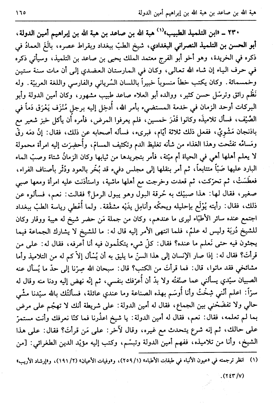 هبة الله بن صاعد بن هبة الله بن إِبْرَاهِيم أَمِين الدولة أَبُو الْحسن ابْن التلميذ النَّصْرَانِي الْبَغْدَادِيّ شيخ الطِّبّ بِبَغْدَاد وبقراط عصره بالغَ العمادُ فِي ذكره فِي الخريدة وَهُوَ أَخُو أَبُو الْفرج مُعْتَمد الْملك يحيى بن صاعد ابْن التلميذ وَسَيَأْتِي ذكره فِي حرف الْيَاء إِن شَاءَ الله تَعَالَى وَكَانَ فِي المارستان العضدي إِلَى أَن مَاتَ سنة سِتِّينَ وَخَمْسمِائة وَكَانَ يكْتب خطا مَنْسُوبا خَبِيرا بِاللِّسَانِ السُرياني والفارسي واللغة الْعَرَبيَّة وَله نَظم رائق وَترسل حسن كثير ووالده أَبُو الْعَلَاء صاعد طَبِيب مَشْهُور وَكَانَ أَمِين الدولة وَأَبُو البركات أوحد الزَّمَان فِي خدمته المستضيء بِأَمْر الزَّمَان أُدخِل إِلَيْهِ برجلٍ مُنزَف يَعرَق دَماً فِي الصَّيف فَسَأَلَ تلاميذَه وَكَانُوا قَدرَ خمسين فَلم يعرفوا الْمَرَض فَأمره أَن يَأْكُل خبز شعير مَعَ باذنجان مَشوِيٍّ فَفعل ذَلِك ثَلَاثَة أَيَّام فبرىء فَسَأَلَهُ أَصْحَابه عَن ذَلِك فَقَالَ إنّ دمَه رقّ ومَسامَّه تفتحت وَهَذَا الْغذَاء من شانه تَغْلِيظ الدَّم وتكثيف المسامّ وأُحضِرَت إِلَيْهِ امْرَأَة مَحْمُولَة لَا يعلم أَهلهَا أَهِي فِي الْحَيَاة أم ميّتة فَأمر بتجريدها من ثِيَابهَا وَكَانَ الزمانُ شتاءً وصبّ المَاء الْبَارِد صَباًّ مُتَتَابِعًا ثمَّ أَمر بنقلها إِلَى مجْلِس دفيء قد بُخّر بِالْعودِ ودُثّر بأصناف الْفراء فعطَسَت ثمَّ تحرّكت ثمَّ قعدت)