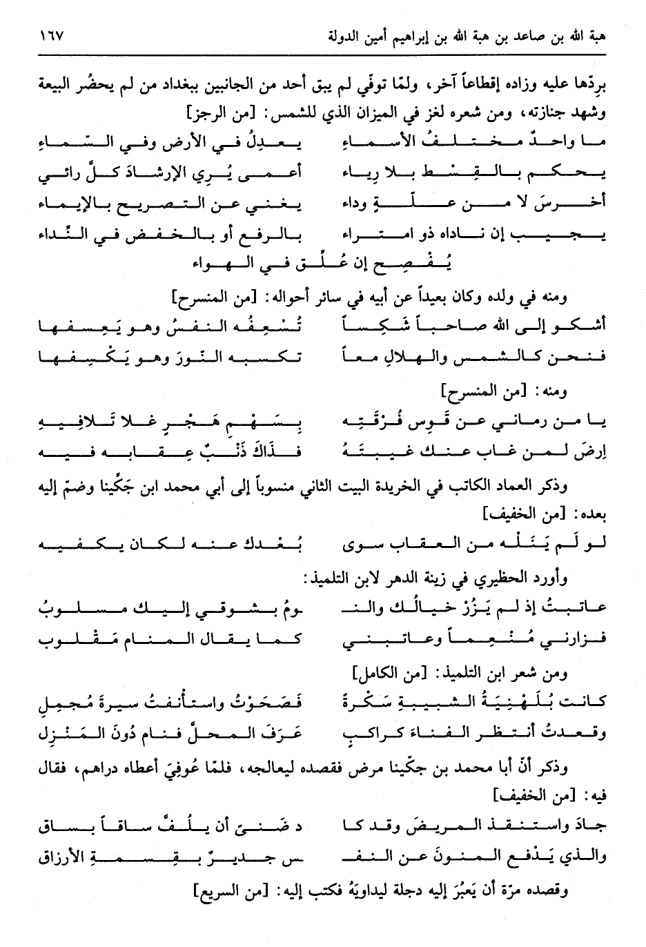 بِردها عَلَيْهِ وزاده إقطاعاً آخر ولمّا توفّي لم يبْق أحد من الْجَانِبَيْنِ بِبَغْدَاد من لم يحضر الْبيعَة وَشهد جنَازَته وَمن شعره لغز فِي الْمِيزَان الَّذِي للشمس