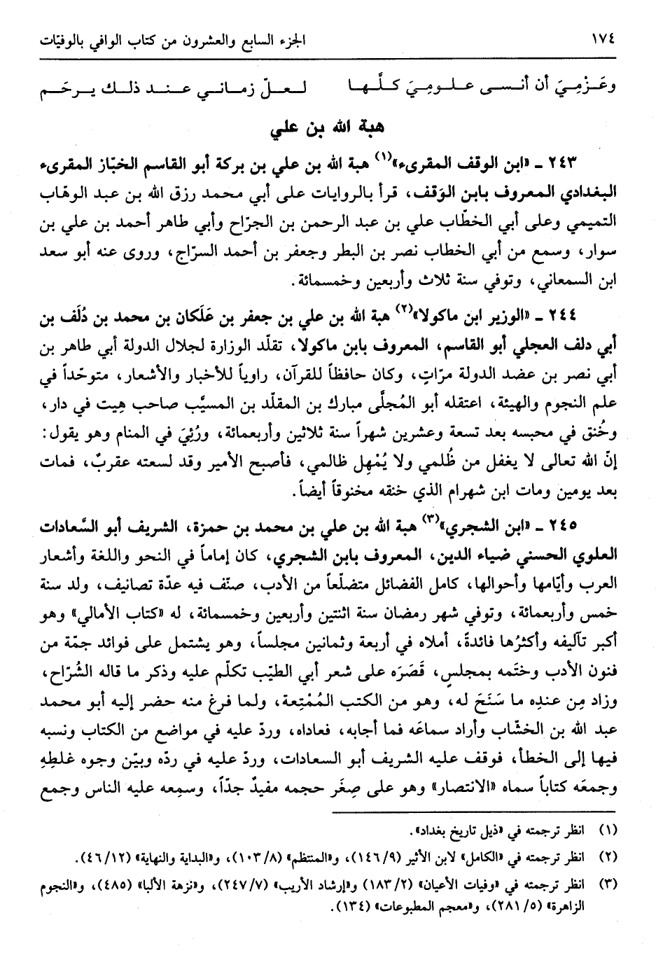 هبة الله بن عَليّ بن مُحَمَّد بن حَمْزَة الشريف أَبُو السعادات الْعلوِي الحسني ضِيَاء الدّين الْمَعْرُوف بِابْن الشجري كَانَ إِمَامًا فِي النَّحْو واللغة وأشعار الْعَرَب وأيّامها وَأَحْوَالهَا كَامِل الْفَضَائِل متضلعاً من الْأَدَب صنف فِيهِ عدَّة تصانيف ولد سنة خمس وَأَرْبَعمِائَة لَهُ كتاب الأمالي وَهُوَ أكبر تآليفه وأكثرُها فَائِدَة أملاه فِي أَرْبَعَة وَثَمَانِينَ مَجْلِسا وَهُوَ يشْتَمل على فَوَائِد جمة من فنون الْأَدَب وختَمه بمجلسٍ قَصَرَه على شعر أبي الطيّب تكلم عَلَيْهِ وَذكر مَا قَالَه الشُرّاج وَزَاد مِن عندِه مَا سَنَحَ لَهُ وَهُوَ من الْكتب المُتممِة وَلما فرغ مِنْهُ حضر إِلَيْهِ أَبُو مُحَمَّد عبد الله بن الخشاب وَأَرَادَ سماعَه فَمَا أَجَابَهُ فعاداه ورد عَلَيْهِ فِي مَوَاضِع من الْكتاب وَنسبه فِيهَا إِلَى الْخَطَأ فَوقف عَلَيْهِ الشريف أَبُو السعادات ورد عَلَيْهِ فِي ردة وبيّن وُجُوه غلطِهِ وجمعَه كتابا سَمَّاهُ الِانْتِصَار وَهُوَ على صِغَر حجمه مفيدٌ جدا وسمِعه عَلَيْهِ النَّاس وَجمع