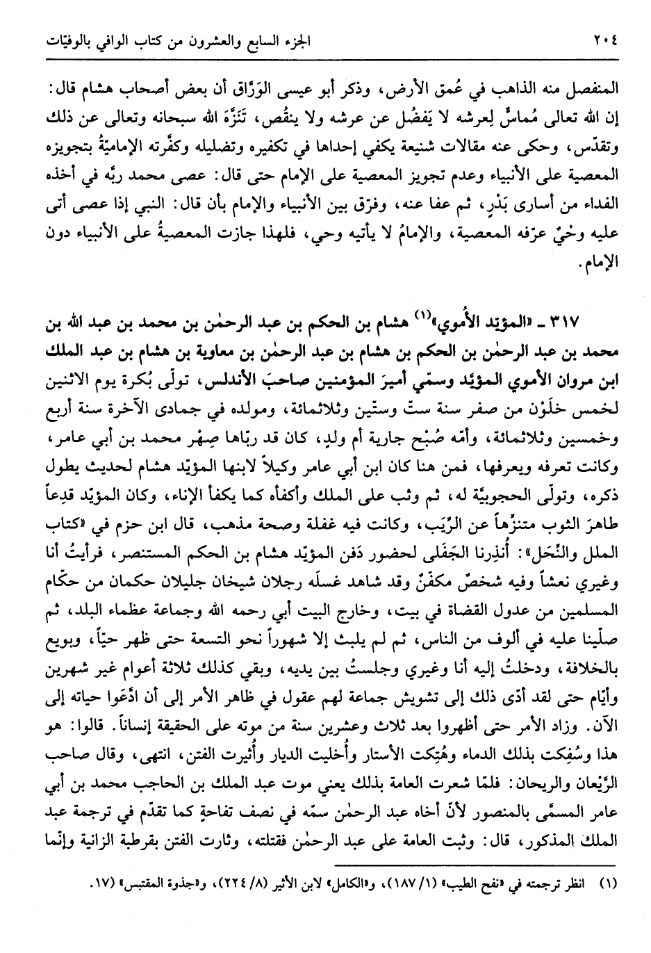 هِشَام بن الحكم بن عبد الرَّحْمَن بن مُحَمَّد بن عبد الله بن مُحَمَّد بن عبد الرَّحْمَن بن الحكم بن هِشَام بن عبد الرَّحْمَن بن مُعَاوِيَة بن هِشَام بن عبد الْملك بن مَرْوَان الاُموي المؤيَّد وسمّى أَمِير الْمُؤمنِينَ صاحبَ الأندلس تولّى بُكرة يَوْم الِاثْنَيْنِ لخمس خلّون من صفر سنة سِتّ وَسِتِّينَ وثلاثمائة ومولده فِي جُمَادَى الْآخِرَة سنة أَربع وَخمسين وثلاثمائة وأمّه صُبح جَارِيَة أم ولدٍ كَانَ قد ربّاها صِهر مُحَمَّد بن أبي عَامر وَكَانَت تعرفه ويعرفها فَمن هُنَا كَانَ ابْن أبي عَامر وَكيلا لابنها الْمُؤَيد هِشَام لحَدِيث يطول ذكره وَتَوَلَّى الحجوبيَّة لَهُ ثمَّ وثب على الْملك وأكفأهُ كَمَا يكفأ الْإِنَاء وَكَانَ الْمُؤَيد قدِعاً طاهرَ الثَّوْب متنزِّهاً عَن الرِيَب وَكَانَت فِيهِ غَفلَة وَصِحَّة مَذْهَب قَالَ ابْن حزم فِي كتاب الْملَل والنِّحَل أُنذِرنا الجَفَلى لحضور دَفن الْمُؤَيد هِشَام بن الحكم الْمُسْتَنْصر فرأيتُ أَنا وغيري نعشا وَفِيه شخصٌ مكفّنٌ وَقد شَاهد غسلَه رجلَانِ شَيْخَانِ جليلان حكمان من حكّام الْمُسلمين من عدُول الْقُضَاة فِي بَيت وخارج الْبَيْت أبي رَحمَه الله وَجَمَاعَة عُظَمَاء الْبَلَد ثمَّ صلّينا عَلَيْهِ فِي أُلُوف من النَّاس ثمَّ لم يليث الاشهوراً نَحْو التِّسْعَة حَتَّى ظهر حَيا وبويع بالخلافة ودخلتُ إِلَيْهِ أَنا وغيري وجلستُ بَين يَدَيْهِ وَبَقِي كَذَلِك ثَلَاثَة أَعْوَام غير شَهْرَيْن وأيّام حَتَّى لقد أدّى ذَلِك إِلَى تشويش جمَاعَة لَهُم عقول فِي ظَاهر الْأَمر إِلَى أَن ادَّعَوا حَيَاته إِلَى الْآن وَزَاد الْأَمر حَتَّى أظهرُوا بعد ثَلَاث وَعشْرين سنة من مَوته على الْحَقِيقَة إنْسَانا قَالُوا هُوَ هَذَا وسُفِكت بذلك الدِّمَاء وهُتِكت الأستار وأُخليت الديار وأُثيرت الْفِتَن انْتهى وَقَالَ صَاحب الرَيعان وَالريحَان فلمّا شَعرت الْعَامَّة بذلك يَعْنِي موت عبد الْملك بن الْحَاجِب مُحَمَّد بن أبي عَامر المسمَّى بالمنصور لأنّ أَخَاهُ عبد الرَّحْمَن سمّه فِي نصف تفاحةٍ كَمَا تقدم فِي تَرْجَمَة عبد الْملك الْمَذْكُور قَالَ وَثَبت الْعَامَّة على عبد الرَّحْمَن فَقتله)