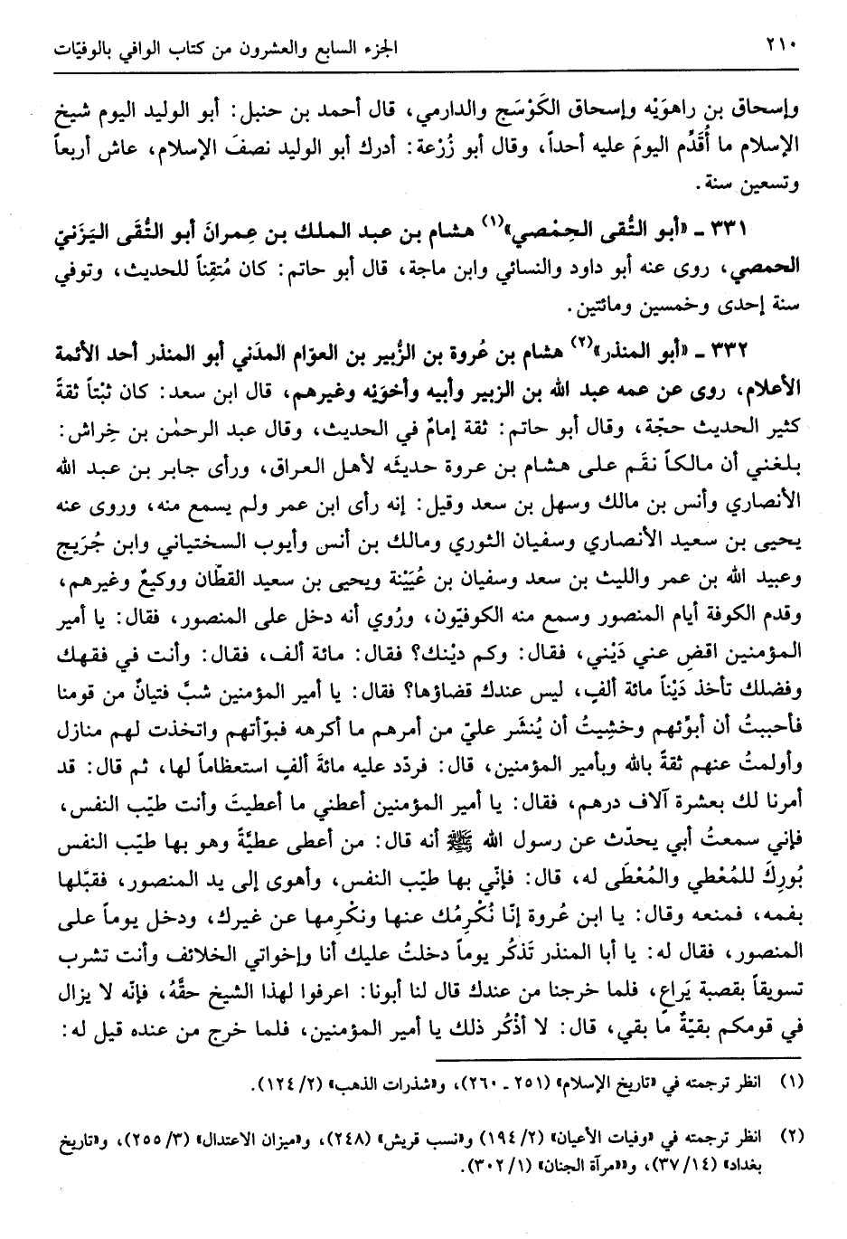 هِشَام بن عُروة بن الزُبير بن الْعَوام المَدني أَبُو المنذرأحد الْأَئِمَّة الْأَعْلَام روى عَن عَمه عبد الله بن الزبير وَأَبِيهِ وأخوَيه وَغَيرهم قَالَ ابْن سعد كَانَ ثبتاً ثِقَة كثير الحَدِيث حجّة وَقَالَ ابو حَاتِم ثِقَة إمامٌ فِي الحَدِيث وَقَالَ عبد الرَّحْمَن بن خِراش بَلغنِي أَن مَالِكًا نقَم على هِشَام بن عُرْوَة حديثَه لأهل الْعرَاق وَرَأى جَابر بن عبد الله الْأنْصَارِيّ وَأنس بن مَالك وَسَهل بن سعد وَقيل إِنَّه رأى ابْن عمر وَلم يسمع مِنْهُ وروى عَنهُ يحيى بن سعيد الْأنْصَارِيّ وسُفْيَان الثَّوْريّ وَمَالك بن أنس وَأَيوب السّخْتِيَانِيّ وَابْن جُريح وَعبيد الله بن عمر وَاللَّيْث بن سعد وسُفْيَان بن عُيَينة وَيحيى بن سعيد الْقطَّان ووكيعٌ وَغَيرهم وَقدم الْكُوفَة أَيَّام الْمَنْصُور وَسمع مِنْهُ الكوفيّون ورُوي أَنه دخل على الْمَنْصُور فَقَالَ يَا أَمِير الْمُؤمنِينَ اقضِ عني دَيني فَقَالَ وَكم دَينك فَقَالَ مائَة ألف فَقَالَ وَأَنت فِي فقهك وفضلك تَأْخُذ دَيناً مائَة ألفٍ لَيْسَ عنْدك قَضَاؤُهَا فَقَالَ يَا أَمِير الْمُؤمنِينَ شبَّ فتيانٌ من قَومنَا فأحببتُ أَن ابوِّئهم وخشيتُ أَن يُنشَر عليّ من أَمرهم مَا أكرهه فبوّاتُهم واتخذت لَهُم منَازِل وأولمتُ عَنْهُم ثِقَة بِاللَّه وبأمير الْمُؤمنِينَ قَالَ فردّد عَلَيْهِ مائةَ ألفٍ مائةَ ألفٍ استعظاماً لَهَا ثمَّ قَالَ قد امرنا لَك بِعشْرَة آلَاف دِرْهَم فَقَالَ يَا أَمِير الْمُؤمنِينَ أَعْطِنِي مَا أعطيتَ وَأَنت طيّب النَّفس فَإِنِّي سَمِعت أبي يحدث عَن رَسُول الله)
