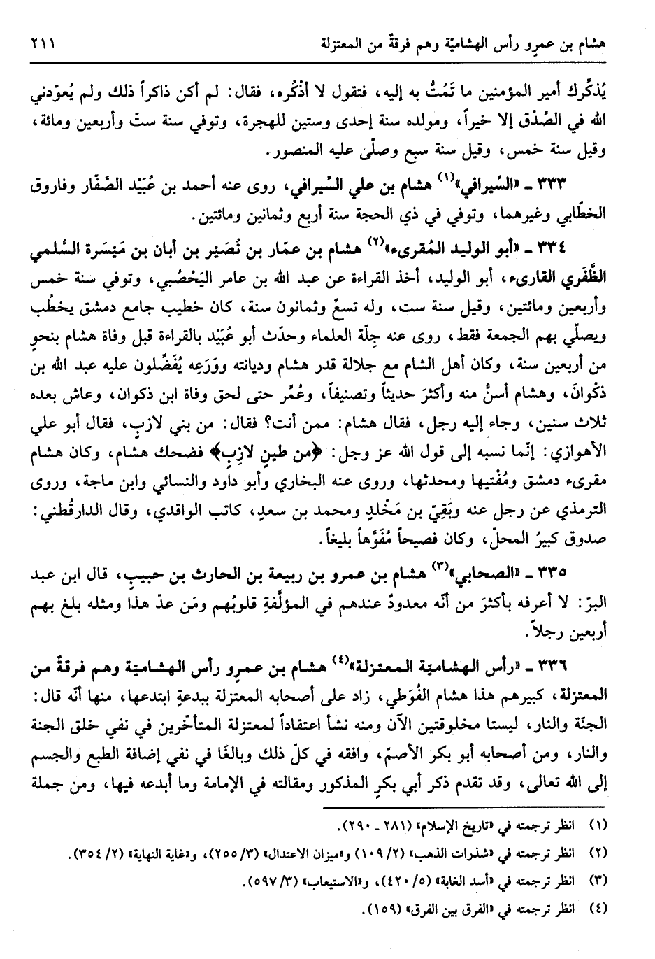 هِشَام بن عمرٍو رَأس الهشاميّة وَهُوَ فرقةٌ من الْمُعْتَزلَة كَبِيرهمْ هَذَا هِشَام الفُوَطي زَاد على أَصْحَابه الْمُعْتَزلَة ببدعةٍ ابتدعها مِنْهَا أَنه قَالَ الجنّة النَّار ليستا مخلوقتين الْآن وَمِنْه نَشأ اعتقاداً لمعتزلة الْمُتَأَخِّرين فِي نفي خلق الْجنَّة وَالنَّار وَمن أَصْحَابه أَبُو بكر الْأَصَم وَافقه فِي كلّ ذَلِك وبالغَا فِي نفي إِضَافَة الطَّبْع والجسم إِلَى الله تَعَالَى وَقد تقم ذكر أبي بكرٍ الْمَذْكُور ومقالته فِي الْإِمَامَة وَمَا أبدعه فِيهَا وَمن جملَة