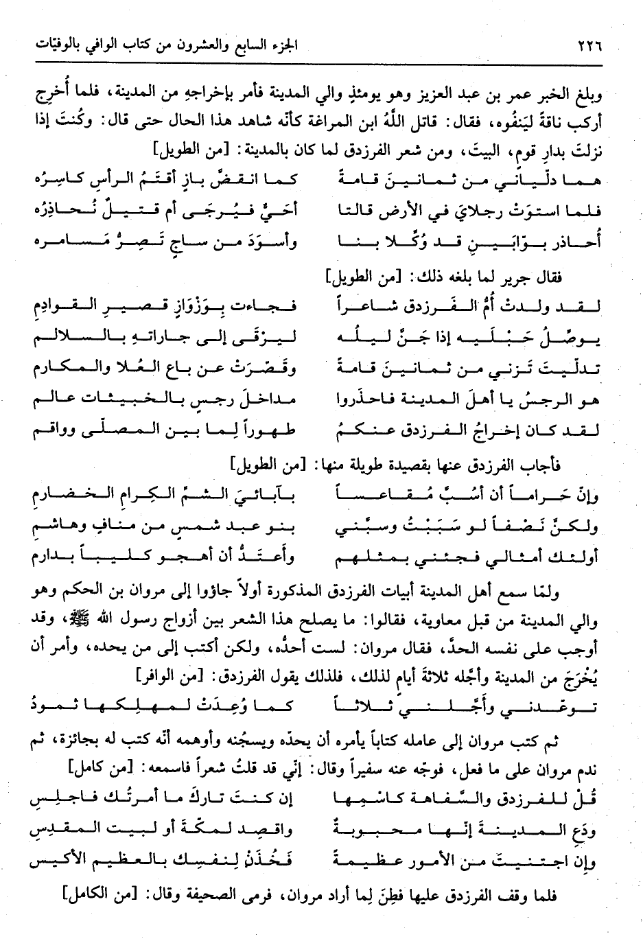 وَبلغ الْخَبَر عمر بن عبد الْعَزِيز وَهُوَ يَوْمئِذٍ وَالِي الْمَدِينَة فَأمر بإخراجهِ من الْمَدِينَة فَلَمَّا أُخرج أركب نَاقَة ليَنفُوَه فَقَالَ قَاتل اللهُ ابْن المراغة كَأَنَّهُ شَاهد هَذَا الْحَال حَتَّى قَالَ وكُنتَ إِذا نزلتَ بدارِ قومٍ البيتَ وَمن شعر الفرزدق لما كَانَ بِالْمَدِينَةِ