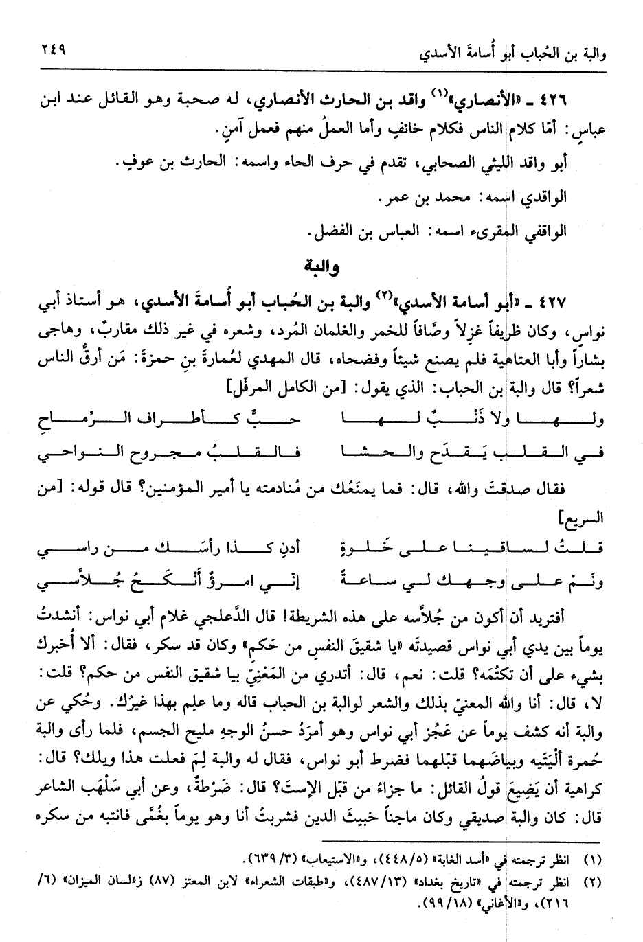 والبة بن الحُباب أَبُو أُسامةَ الْأَسدي هُوَ أستاذ أبي نواسٍ وَكَانَ ظريفاً غزِلاً وصَّافاً للخمر والغلمان المُرد وشعره فِي غير ذَلِك مقاربٌ وهاجى بشاراً وابا العتاهة فَلم يصنع شَيْئا وفضحاه قَالَ الْمهْدي لعُمارةَ بن حمزةَ مَن أرقُّ النَّاس شعرًا قَالَ والبة بن الْجبَاب الَّذِي يَقُول
