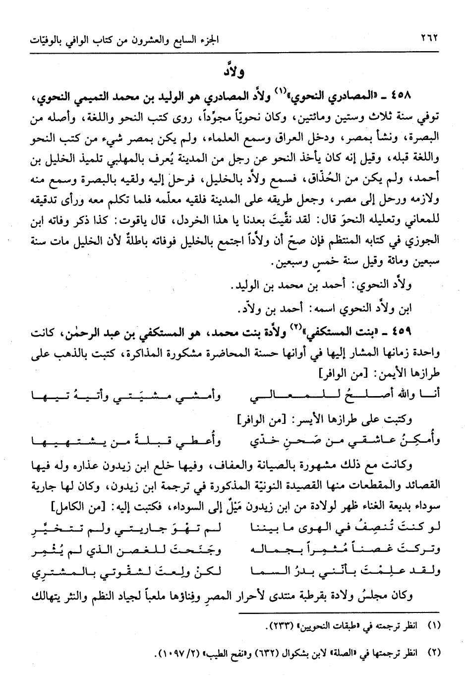 ولاّدة بنت مُحَمَّد هُوَ المستكفي بن عبد الرَّحْمَن كَانَت وَاحِدَة زمانها الْمشَار إِلَيْهَا فِي أوانها حَسَنَة المحاضرة مشكورة المذاكرة كتبت بِالذَّهَب على طرازها الْأَيْمن