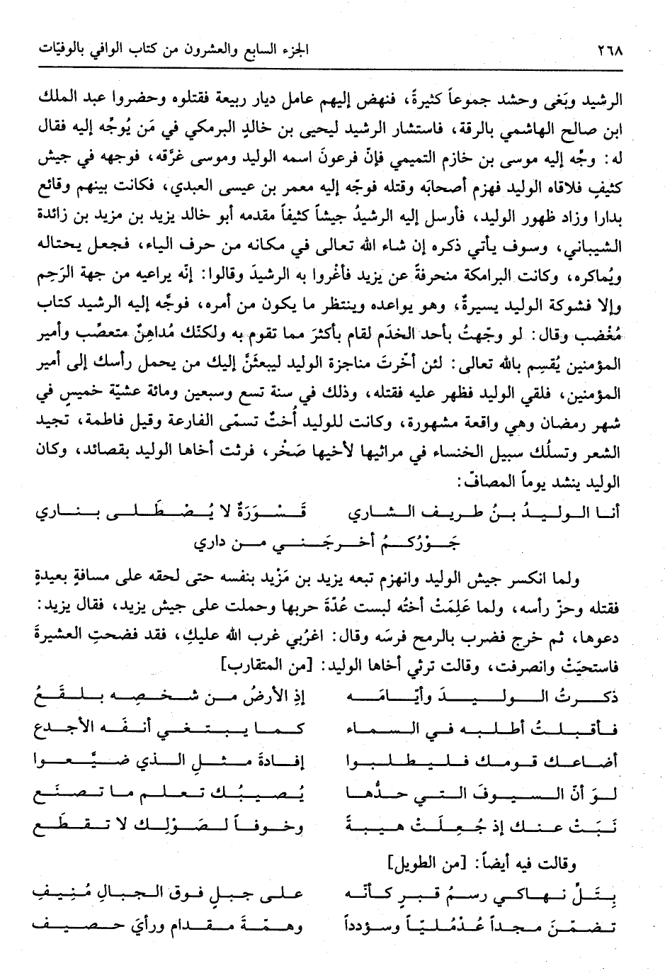 الرشيد وبَغى وحشد جموعاً كَثِيرَة فَنَهَضَ إِلَيْهِم عَامل ديار ربيعَة فَقَتَلُوهُ وحضروا عبد الْملك بن صَالح الْهَاشِمِي بالرقة فَاسْتَشَارَ الرشيد ليحيى بن خالدٍ الْبَرْمَكِي فِي مَن يُوجِّه إِلَيْهِ فَقَالَ لَهُ وجِّه إِلَيْهِ مُوسَى بن خازم التَّمِيمِي فإنّ فرعونَ اسْمه الْوَلِيد ومُوسَى غرَّقه فوجهه فِي جَيش كثيفٍ فلاقاه الْوَلِيد فَهزمَ أصحابَه وَقَتله فوجّه إِلَيْهِ معمر بن عِيسَى الْعَبْدي فَكَانَت بَينهم وقائع بدارا وَزَاد ظُهُور الْوَلِيد فَأرْسل إِلَيْهِ الرشيدُ جَيْشًا كثيفاً مقدمه أَبُو خَالِد يزِيد بن مزِيد بن زَائِدَة الشَّيْبَانِيّ وسوف يَأْتِي ذكره إِن شَاءَ الله تَعَالَى فِي مَكَانَهُ من حرف الْيَاء فَجعل يحتاله ويماكره وَكَانَت البرامكة منحرفةً عَن يزِيد فأغرَوا بِهِ الرشيدَ وَقَالُوا إِنَّه يراعيه من جِهَة الرَحِم وَإِلَّا فشوكة الْوَلِيد يسيرةٌ وَهُوَ يواعده وينتظر مَا يكون من أمره فوجَّه إِلَيْهِ الرشيد كتاب مُغضب وَقَالَ لَو وجّهتُ بِأحد الخَدم لقام بأكثرَ مِمَّا تقوم بِهِ ولكنّك مُداهِنٌ متعصب وأمير الْمُؤمنِينَ يقسم بِاللَّه تَعَالَى لَئِن أخرت مناجزة الْوَلِيد ليبْعَثن إِلَيْك من يحمل رَأسك إِلَى أَمِير الْمُؤمنِينَ فلقي الْوَلِيد فَظهر عَلَيْهِ فَقتله وَذَلِكَ فِي سنة تسع وَسبعين وَمِائَة عشيّة خَمِيس فِي شهر رَمَضَان وَهِي وَاقعَة مَشْهُورَة وَكَانَت للوليد أُختٌ تسمّى الفارعة وَقيل فَاطِمَة تجيد الشّعْر وتسلُك سَبِيل الخنساء)