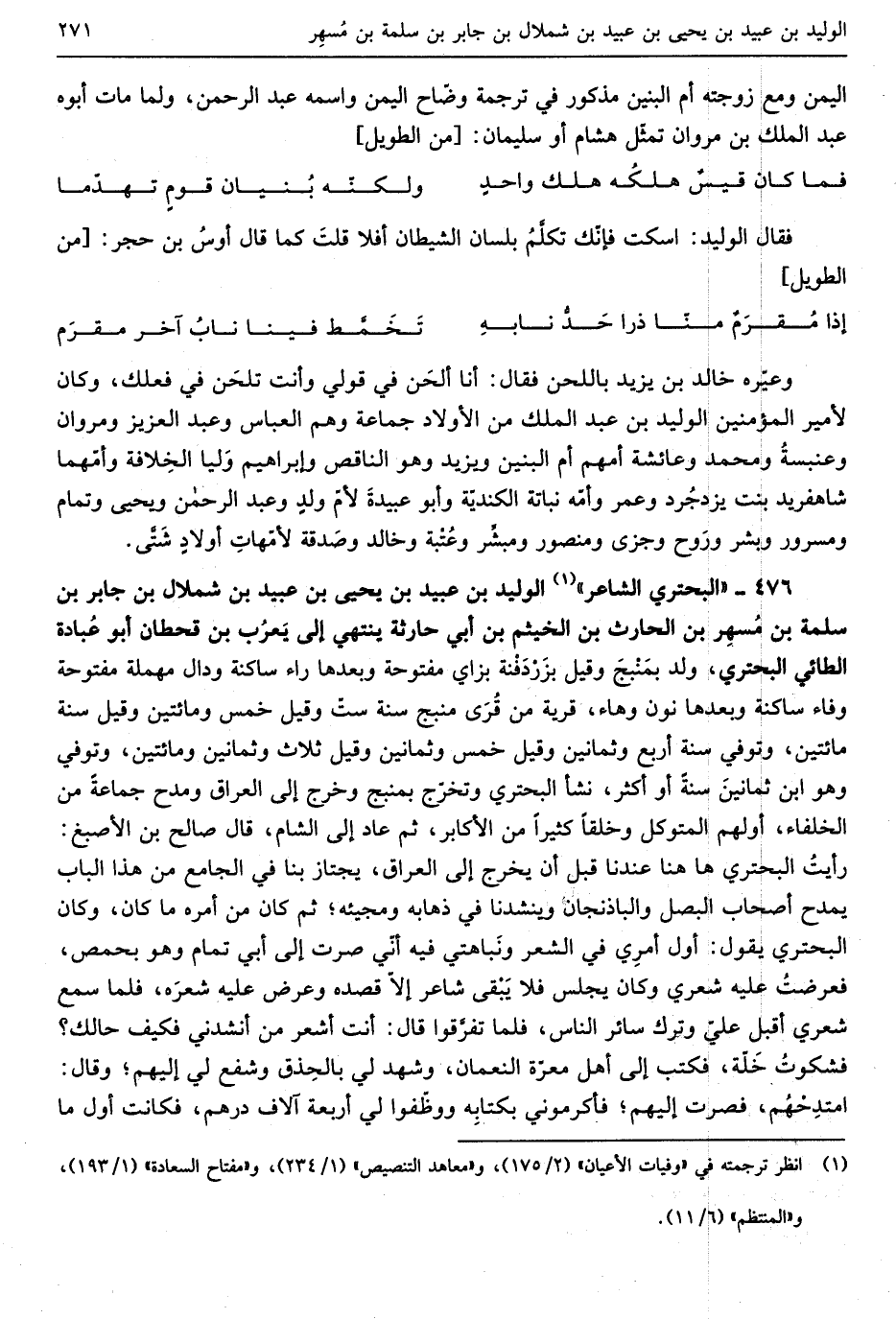 الْوَلِيد بن عبيد بن يحيى بن عبيد بن شملال بن جَابر بن سَلمَة بن مُسهِر بن الْحَارِث بن الخيثم بن أبي الحارثة يَنْتَهِي إِلَى يَعرُب بن قحطان أَبُو عُبادة الطَّائِي البحتري ولد بِمَنبِج وَقيل بزَردَفنه بزاي مَفْتُوحَة وَبعدهَا رَاء سَاكِنة ودال مُهْملَة مَفْتُوحَة وَفَاء سَاكِنة وَبعدهَا نون وهاء قَرْيَة من قُرى منبج سنة ستّ وَقيل سنة خمسٍ وَمِائَتَيْنِ وَقيل سنة مِائَتَيْنِ وَتُوفِّي سنة أَربع وَثَمَانِينَ وَقيل خممس وَثَمَانِينَ وَقيل ثَلَاث وَثَمَانِينَ وَمِائَتَيْنِ وَتُوفِّي وَهُوَ ابْن ثمانينَ سنة أَو أَكثر نَشأ البحتري وتخرّج بمنبج وَخرج إِلَى الْعرَاق ومدح جمَاعَة من الْخُلَفَاء أَوَّلهمْ المتَوَكل وخلقاً كثيرا من الأكابر ثمَّ عَاد إِلَى الشَّام قَالَ صَالح بن الْأَصْبَغ رأيتُ النَّحْوِيّ هَا هُنَا عندنَا قبل أَن يخرج إِلَى الْعرَاق يجتاز بِنَا فِي الْجَامِع من هَذَا الْبَاب يمدح أَصْحَاب البصل والباذنجان وينشدنا فِي ذَهَابه ومجيئه ثمَّ كَانَ أمره مَا كَانَ وَكَانَ البحتري يَقُول أول أمرِي فِي الشّعْر ونَباهتي فِيهِ أَنِّي صرت إِلَى أبي تَمام وَهُوَ بحمص فعرضتُ عَلَيْهِ شعري وَكَانَ يجلس فَلَا يَبقى شَاعِر إِلَّا قَصده وَعرض عَلَيْهِ شعرَه فَلَمَّا سمع شعري أقبل عليّ وَترك سَائِر النَّاس فَلَمَّا تفرَّقوا قَالَ أَنْت أشعر من أَنْشدني فَكيف حالك فشكوتُ خَلّة فَكتب إِلَى أهل معرّة النُّعْمَان وَشهد لي بالحِذق وشفع لي إِلَيْهِم وَقَالَ امتدِحهُم فصرت إِلَيْهِم فأكرموني بكتابِه ووظّفوا لي أَرْبَعَة آلَاف دِرْهَم فَكَانَت أول مَا
