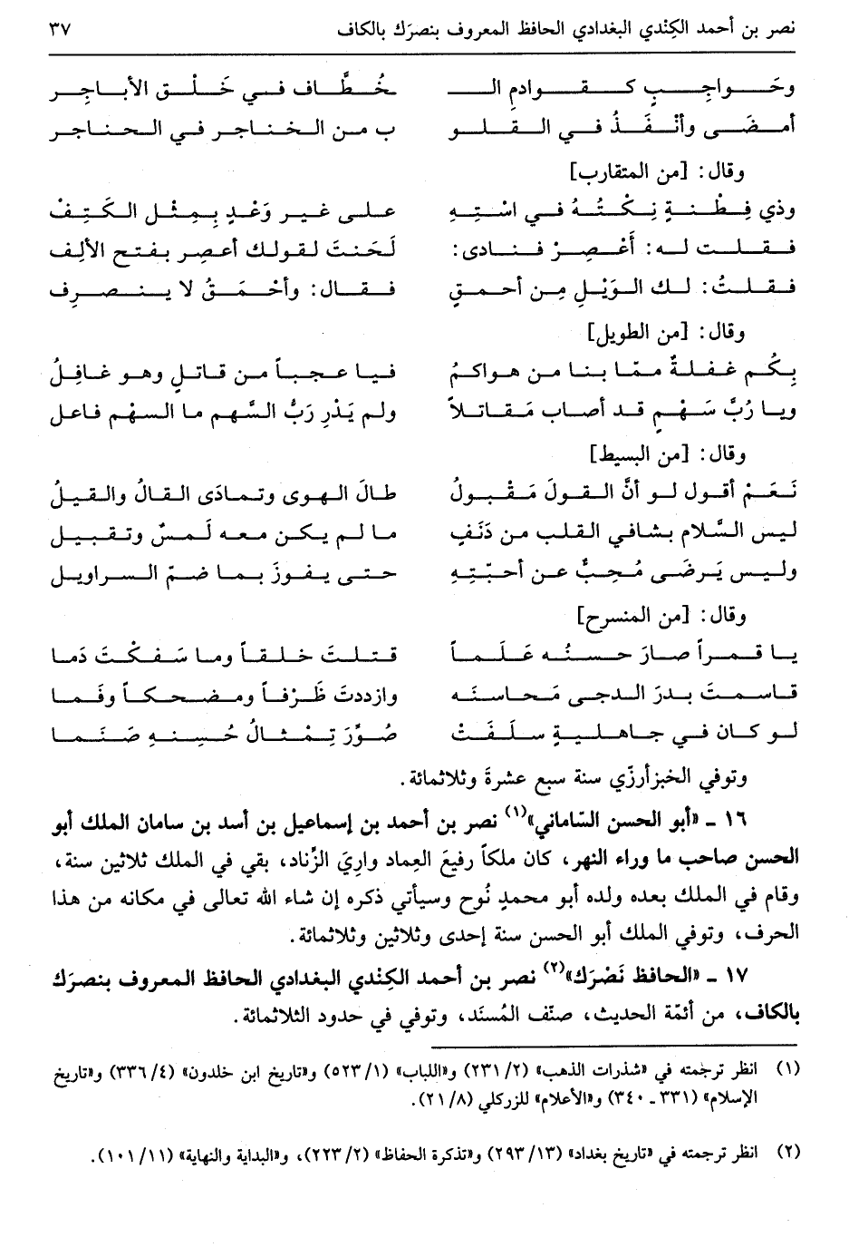 نصر بن أَحْمد الكِندي الْبَغْدَادِيّ الْحَافِظ الْمَعْرُوف بنصرَك بِالْكَاف من أَئِمَّة الحَدِيث صنَّف المُسند وَتُوفِّي فِي حُدُود الثلاثمائة