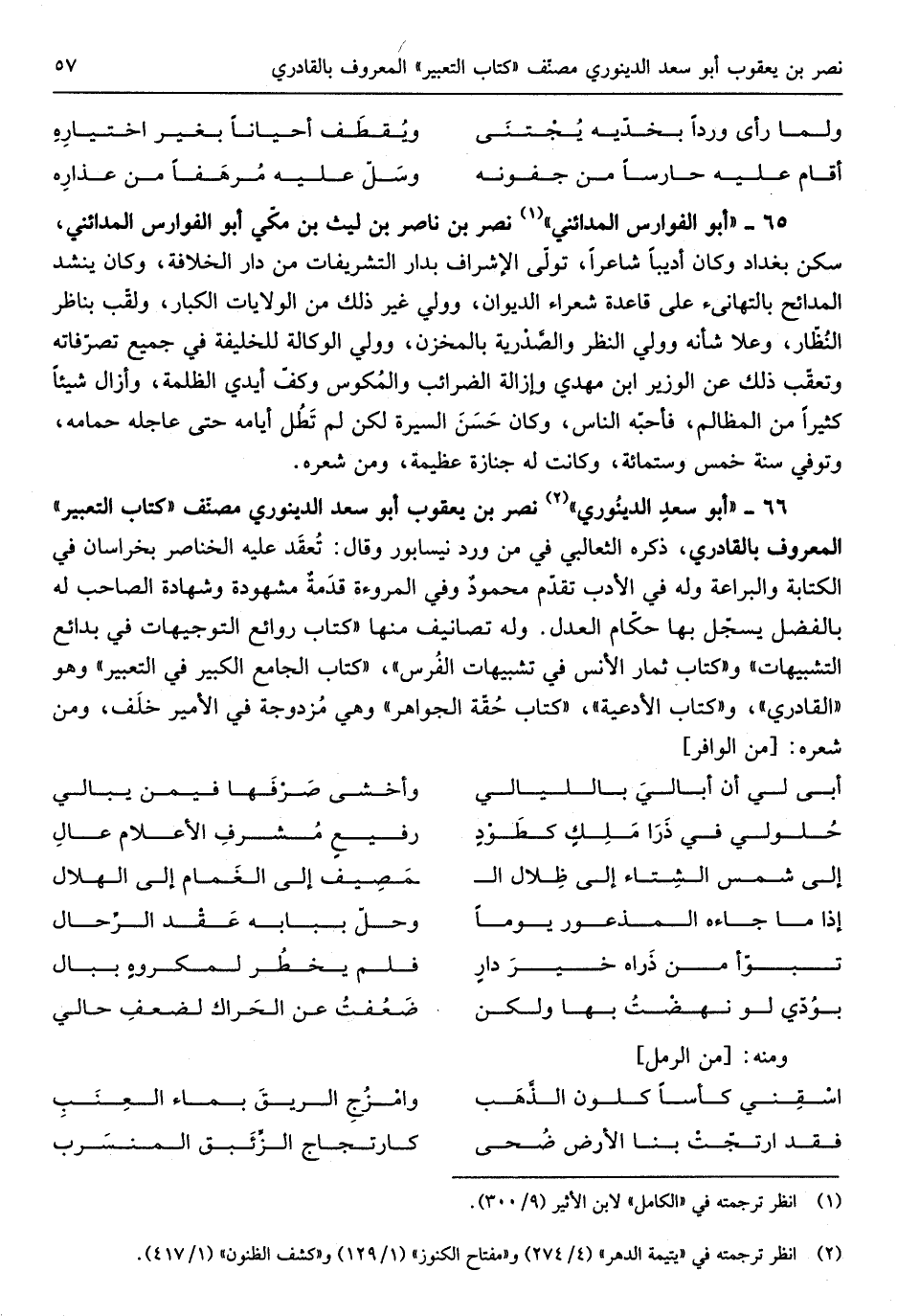نصر بن يَعْقُوب أَبُو سعد الدينَوَرِي مُصَنف كتاب التَّعْبِير الْمَعْرُوف بالقادري ذكره الثعالبي فِي من ورد نيسابور وَقَالَ تُعقَد عَلَيْهِ الخناصر بخراسان فِي الْكِتَابَة والبراعة وَله فِي الْأَدَب تقدم محمودٌوفي الْمُرُوءَة قدَمةٌ مَشْهُودَة وَشَهَادَة الصاحب لَهُ بِالْفَضْلِ يسجل بهَا حكام الْعدْل