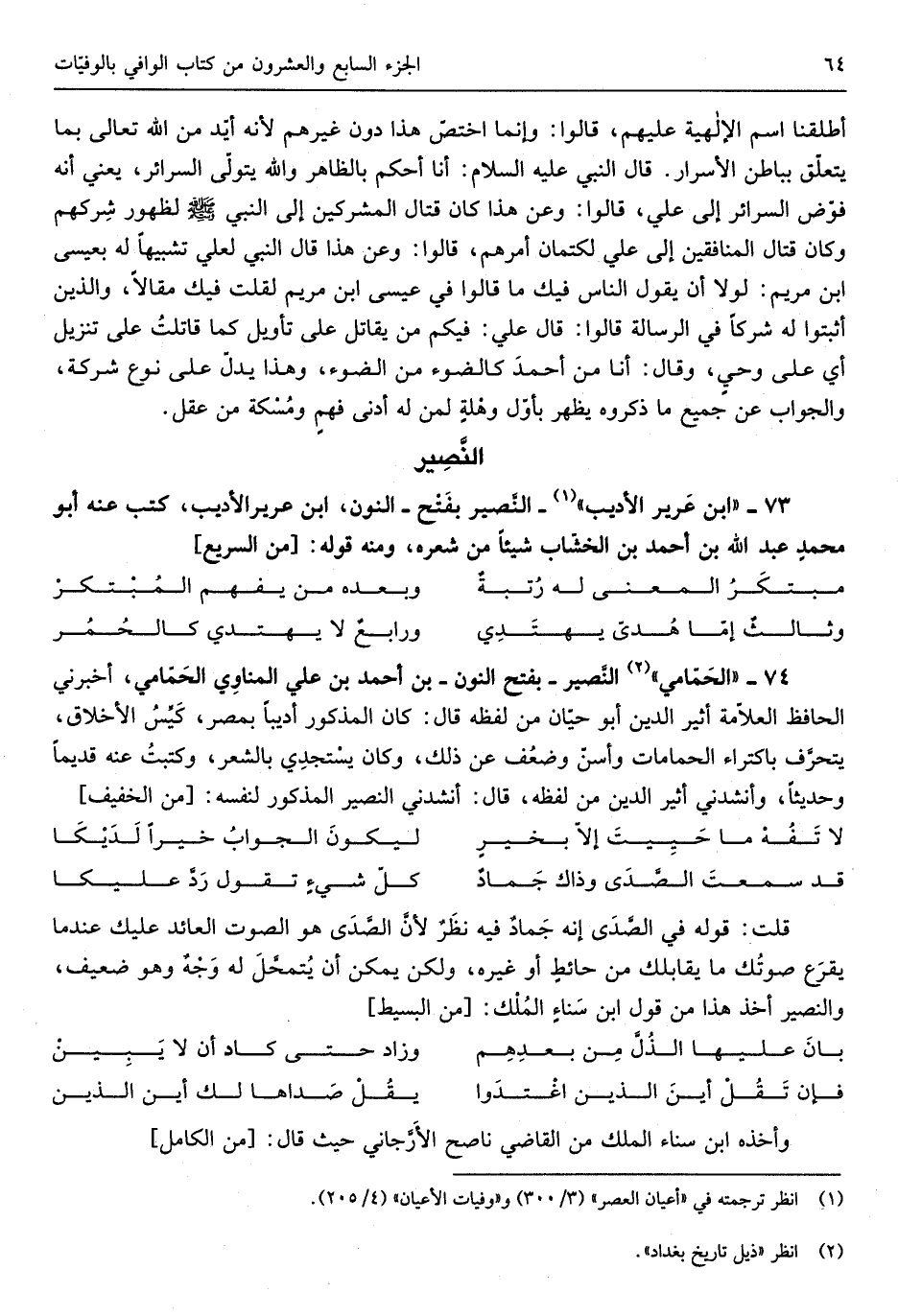 النَصير بِفَتْح النُّون بن أَحْمد بن عَليّ المناوِي الحَمَامي أَخْبرنِي الْحَافِظ العلاّمة أثير الدّين أَبُو حَيَّان من لَفظه قَالَ كَانَ الْمَذْكُور أديباً بِمصْر كَيَّسُ الْأَخْلَاق يتحرف باكتراء الحمامات وأسن وَضعف عَن ذَلِك وَكَانَ يستجدي بالشعر وكتبتُ عَنهُ قَدِيما وحديثاً وأنشدني أثير الدّين من لَفظه قَالَ أَنْشدني النصير الْمَذْكُور لنَفسِهِ