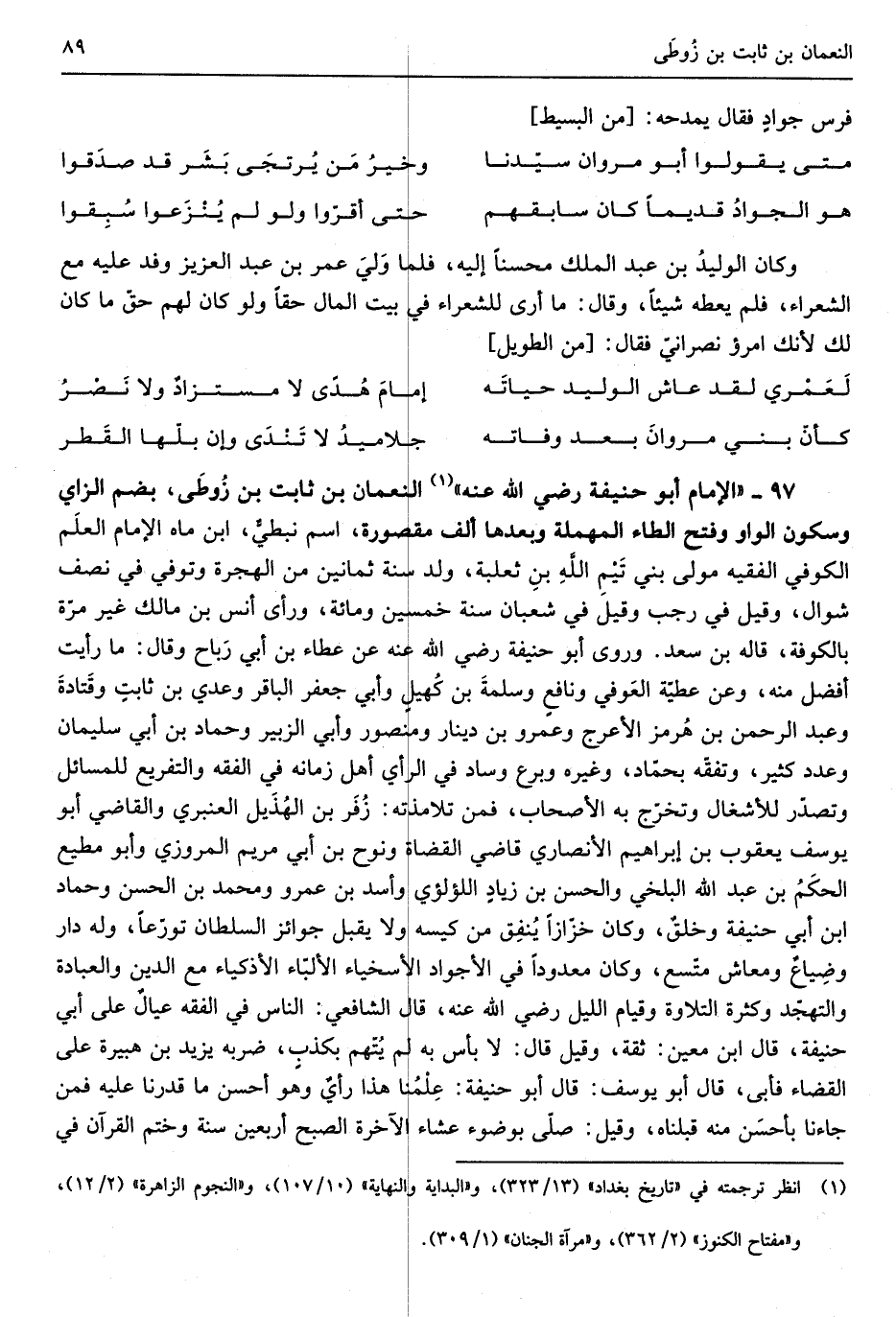 النُّعْمَان بن ثَابت بن زوُطَى بِضَم الزَّاي وَسُكُون الْوَاو وَفتح الطَّاء الْمُهْملَة وَبعدهَا ألف مَقْصُورَة اسْم نبطيٌّ ابْن ماه الإِمَام العلَم الْكُوفِي الْفَقِيه مولى بني تَميمِ الله بنِ ثَعْلَبَة ولد سنة ثَمَانِينَ من الْهِجْرَة وَتُوفِّي فِي نصف شَوَّال وَقيل فِي رَجَب وَقيل فِي شعْبَان سنة خمسين وَمِائَة وَرَأى أنس بن مَالك غير مرّة بِالْكُوفَةِ قَالَه بن سعد وروى أَبُو حنيفَة رَضِي الله عَنهُ عَن عَطاء بن أبي رَباح وَقَالَ مَا رَأَيْت أفضل مِنْهُ وَعَن عَطِيَّة العَوفي ونافعٍ وسلمَة بن كُهيلٍ وَأبي جَعْفَر الباقر وعدي بن ثابتٍ وقَتادة وَعبد الرَّحْمَن بن هُرمز الْأَعْرَج وَعَمْرو بن دِينَار وَمَنْصُور وَأبي الزبير وَحَمَّاد بن أبي سُلَيْمَان وَعدد كثير وتفقه بحماد وَغَيره وبرع وساد فِي)