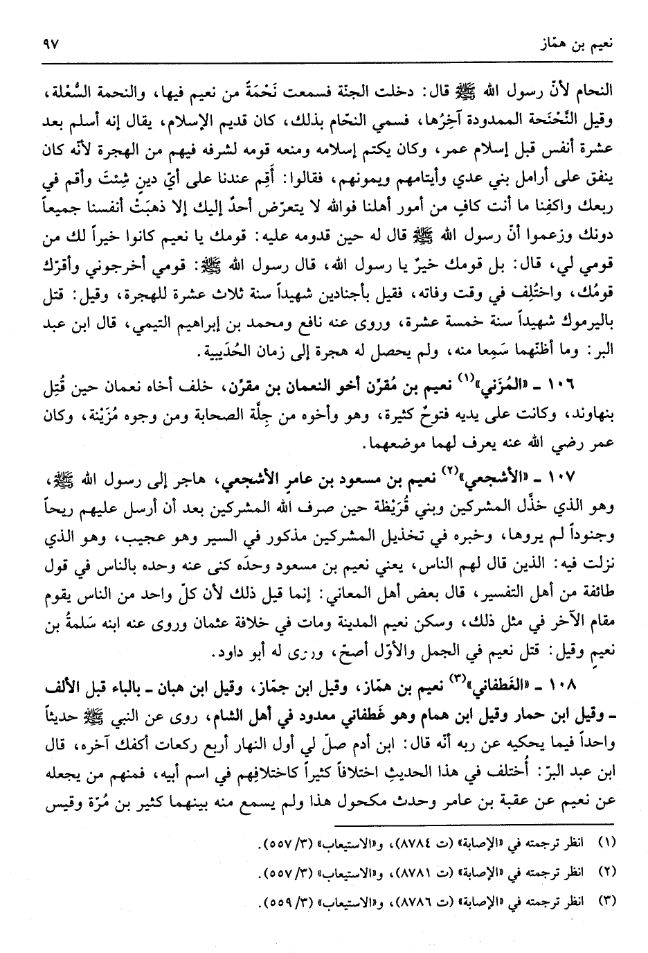 النحام لأنّ رَسُول الله صلى الله عَلَيْهِ وَسلم قَالَ دخلتُ الْجنَّة فَسمِعت نَحمَةً من نعيم فِيهَا والنحمة السُّعلة وَقيل النَّحنَحة الممدودة آخِرُها فَسُمي النحام بذلك كَانَ قديم الْإِسْلَام يُقَال إِنَّه أسلم بعد عشرَة أنفس قبل إِسْلَام عمر وَكَانَ يكتم إِسْلَام وَمنعه قومه لشرفه فيهم من الْهِجْرَة لِأَنَّهُ كَانَ ينْفق على أرامل بني عدي وأيتامهم ويمونهم فَقَالُوا أقِم عندنَا على أيّ دينٍ شِئتَ وأقم فِي ربعك واكفِنا مَا أَنْت كافٍ من أُمُور أهلنا فو الله لَا يتَعَرَّض أحدٌ إِلَيْك إِلَّا ذهبَت أَنْفُسنَا جَمِيعًا دُونك وَزَعَمُوا أَن رَسُول الله صلى الله عَلَيْهِ وَسلم قَالَ لَهُ حِين قدومه عَلَيْهِ قَوْمك يَا نعيم كَانُوا خيرا لَك من قومِي لي قَالَ بل قَوْمك خيرٌ يَا رَسُول الله قَالَ رَسُول الله صلى الله عَلَيْهِ وَسلم قومِي أَخْرجُونِي وأقرك قومُك واختُلِف فِي وَقت وَفَاته فَقيل بأجنادين شَهِيدا سنة ثَلَاث عشرَة لِلْهِجْرَةِ وَقيل قتل باليرموك شَهِيدا سنة خَمْسَة عشرَة وروى عَنهُ نَافِع وَمُحَمّد بن إِبْرَاهِيم التَّيْمِيّ قَالَ ابْن عبد الْبر وَمَا أظنهما سَمِعا مِنْهُ وَلم يحصل لَهُ هِجْرَة إِلَى زمَان الحُدَيبية