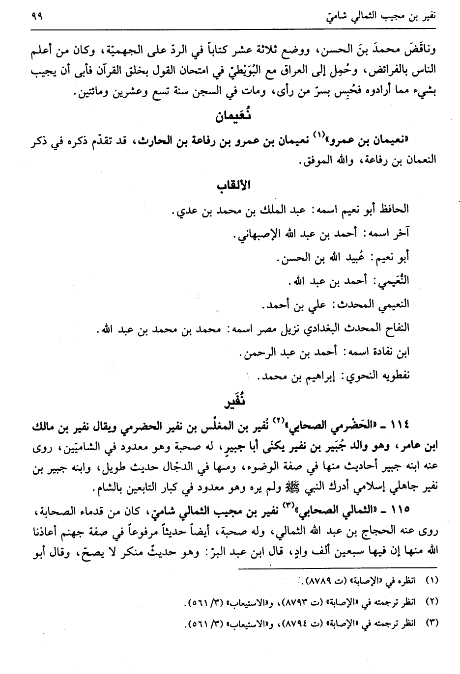 نفير بن مُجيب الثمالِي شاميّ كَانَ من قدماء الصَّحَابَة روى عَنهُ الْحجَّاج بن عبد الله الثمالِي وَله صُحْبَة أَيْضا حَدِيثا مَرْفُوعا فِي صفة جَهَنَّم أعاذنا الله مِنْهَا إِن فِيهَا سبعين ألف وادٍ قَالَ ابْن عبد البرّ وَهُوَ حديثٌ مُنكر لَا يصحّ وَقَالَ أَبُو