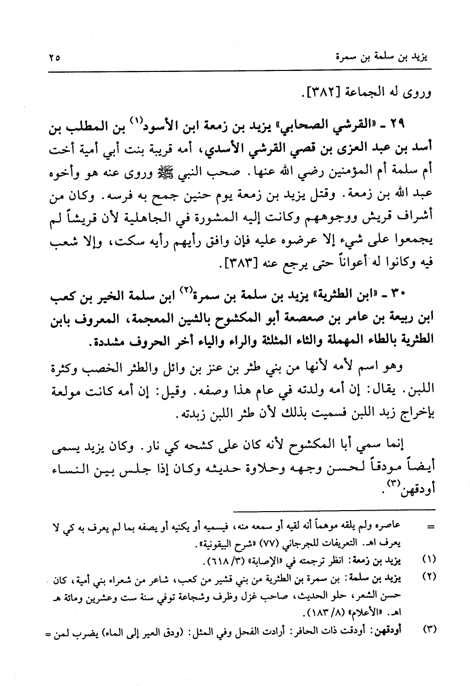 29 - الْقرشِي الصَّحَابِيّ يزِيد بن زَمعَة ابْن الْأسود بن الْمطلب بن أَسد بن عبد العُزَّى بن قُصيّ الْقرشِي الْأَسدي أمه قُريبة بنت أبي أُميَّة أُخْت أم سَلمَة أم الْمُؤمنِينَ رَضِي الله عَنْهَا صحب النبيّ صلى الله عَلَيْهِ وَسلم وروى عَنهُ هُوَ وَأَخُوهُ عبد الله بن زَمعَة وَقتل يزِيد بن زَمعَة يَوْم حنين جمح بِهِ فرسه وَكَانَ من أَشْرَاف قُرَيْش ووجوههم وَكَانَت إِلَيْهِ المشورة فِي الْجَاهِلِيَّة لِأَن قُريْشًا لم يجمعوا على شَيْء إِلَّا عرضوه عَلَيْهِ فَإِن وَافق رَأْيهمْ رَأْيه سكت وَإِلَّا شعب فِيهِ وَكَانُوا لَهُ أعوانا حَتَّى يرجع عَنهُ [383]