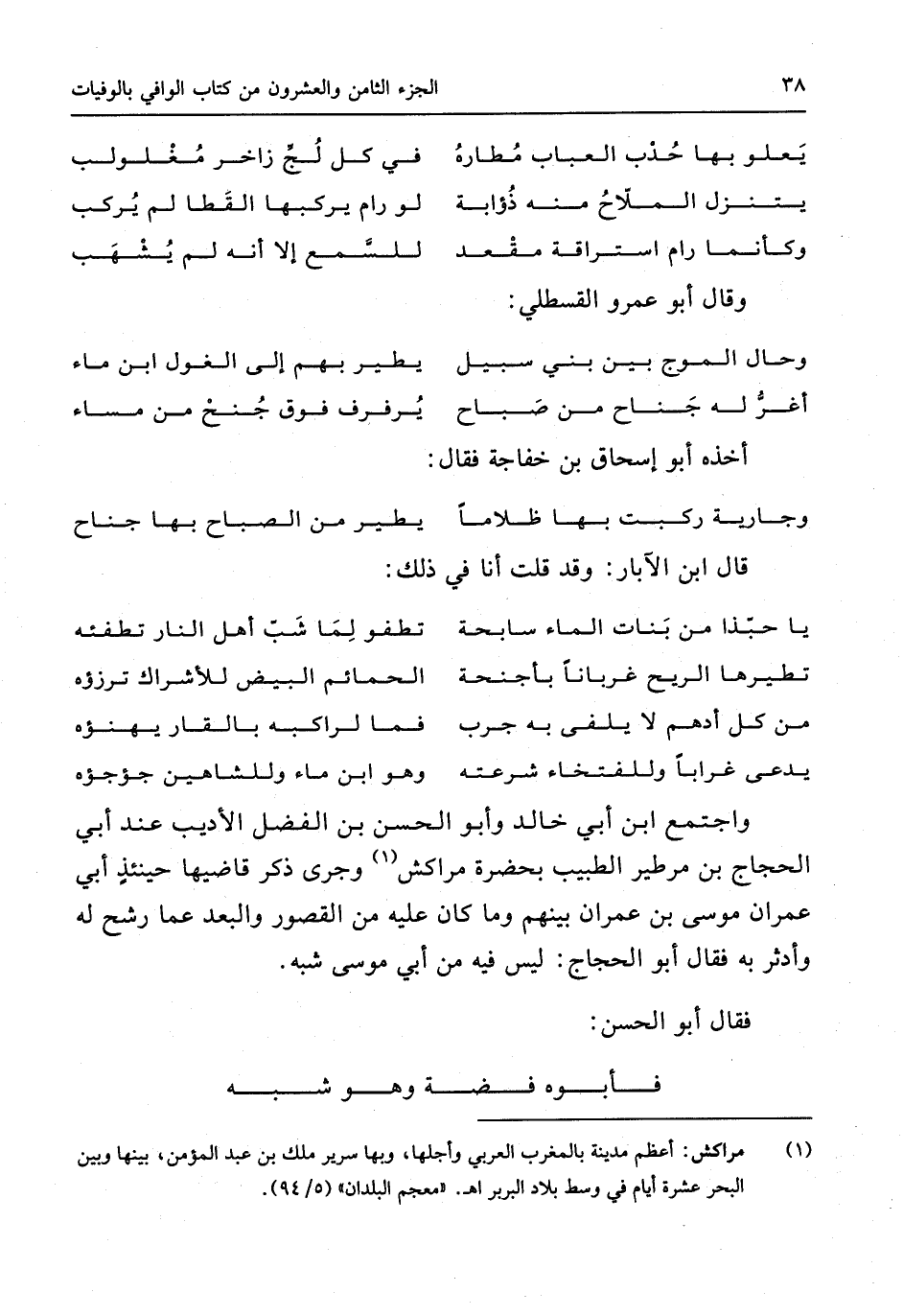 وَاجْتمعَ ابْن أبي خَالِد وَأَبُو الْحسن بن الْفضل الأديب عِنْد أبي الْحجَّاج بن مرطير الطَّبِيب بِحَضْرَة مراكش وَجرى ذكر قاضيها حِينَئِذٍ أبي عمرَان مُوسَى بن عمرَان بَينهم وَمَا كَانَ عَلَيْهِ من الْقُصُور والبعد عَمَّا رشح لَهُ وأدثر بِهِ فَقَالَ أَبُو الْحجَّاج لَيْسَ فِيهِ من أبي مُوسَى شبه