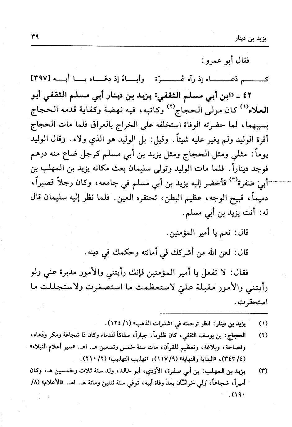42 - ابْن أبي مُسلم الثَّقَفِيّ يزِيد بن دِينَار أبي مُسلم الثَّقَفِيّ أَبُو الْعَلَاء كَانَ مولى الْحجَّاج وكاتبه فِيهِ نهضة وكفاية قدمه الْحجَّاج بسببهما لما حَضرته الْوَفَاة اسْتَخْلَفَهُ على الْخراج بالعراق فَلَمَّا مَاتَ الْحجَّاج أقرة الْوَلِيد وَلم يُغير عَلَيْهِ شَيْئا وَقيل بل الْوَلِيد هُوَ الَّذِي ولاه وَقَالَ الْوَلِيد يَوْمًا مثلي وَمثل الْحجَّاج وَمثل يزِيد بن أبي مُسلم كَرجل ضَاعَ مِنْهُ دِرْهَم فَوجدَ دِينَارا فَمَا مَاتَ الْوَلِيد وَتَوَلَّى سُلَيْمَان بعث مَكَانَهُ يزِيد بن الْمُهلب بن أبي صفرَة فأحضر إِلَيْهِ يزِيد بن أبي مُسلم فِي جَامعه وَكَانَ رجلا قَصِيرا دميما قَبِيح الْوَجْه عَظِيم الْبَطن تحتقره الْعين فَلَمَّا نظر إِلَيْهِ سُلَيْمَان قَالَ لَهُ أَنْت يزِيد بن أبي مُسلم