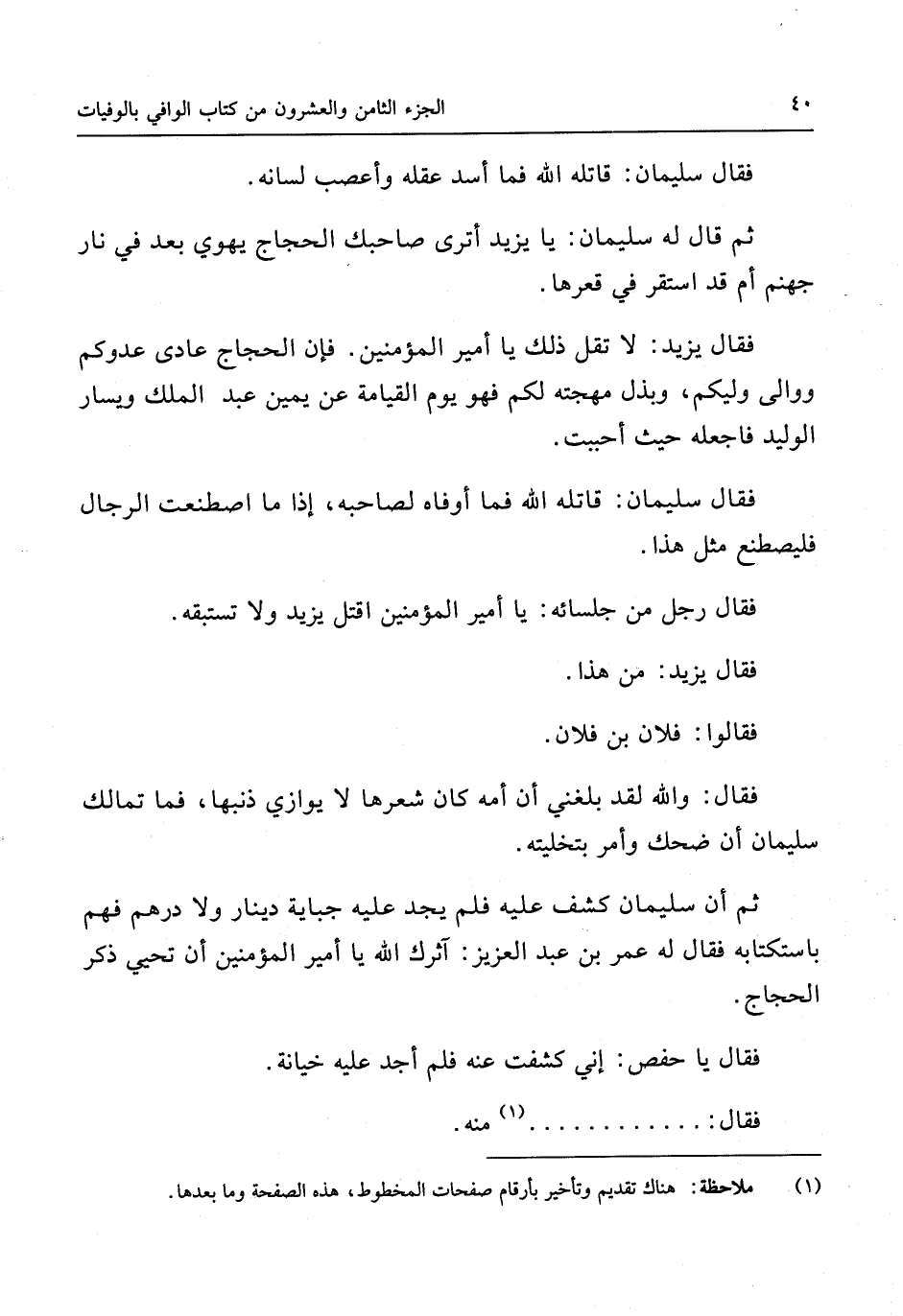 ثمَّ أَن سُلَيْمَان كشف عَلَيْهِ فَلم يجد عَلَيْهِ جباية دِينَار وَلَا دِرْهَم فهم باستكتابه فَقَالَ لَهُ عَم بن عبد الْعَزِيز آثرك الله يَا أَمِير الْمُؤمنِينَ أَن تحبي ذكر الْحجَّاج