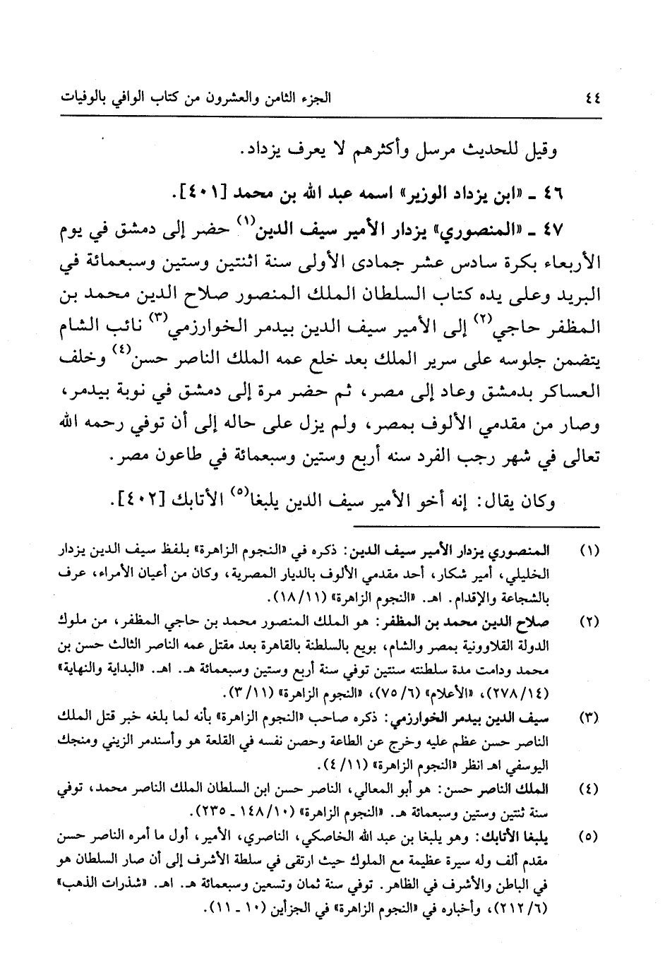 47 - المنصوري يزْدَاد الْأَمِير سيف الدّين حضر إِلَى دمشق فِي يَوْم الْأَرْبَعَاء بكرَة سادس عشر جُمَادَى الأولى سنة اثْنَتَيْنِ وَسِتِّينَ وَسَبْعمائة فِي الْبَرِيد وعَلى يَده كتاب السُّلْطَان الْملك الْمَنْصُور صَلَاح الدّين مُحَمَّد بن المظفر حاجي إِلَى الْأَمِير سيف الدّين بيدمر الْخَوَارِزْمِيّ نَائِب الشَّام يتَضَمَّن جُلُوسه على سَرِير الْملك بعد خلع عَمه الْملك النَّاصِر حسن وَخلف العساكر بِدِمَشْق وَعَاد إِلَى مصر ثمَّ حضر مرّة إِلَى دمشق فِي نوبَة بيدمر وَصَارَ من مقدمي الألوف بِمصْر وَلَمْ يزل عَلَى حَاله إِلَى أَن توفّي رَحمَه الله تَعَالَى فِي شهر رَجَب الْفَرد سنة أَربع وَسِتِّينَ وَسَبْعمائة فِي طاعون مصر