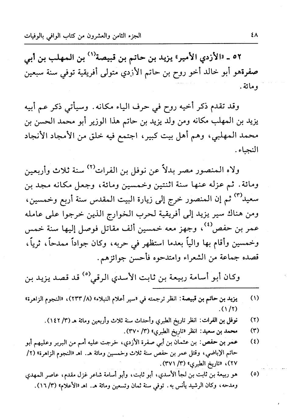 52 - الْأَزْدِيّ الْأَمِير يزِيد بن حَاتِم بنقبيصة بن الْمُهلب بن أبي صفرَة هُوَ أَبُو خَالِد أَخُو روح بن حَاتِم الْأَزْدِيّ متولى أفريقية توفّي سنة سبعين وَمِائَة