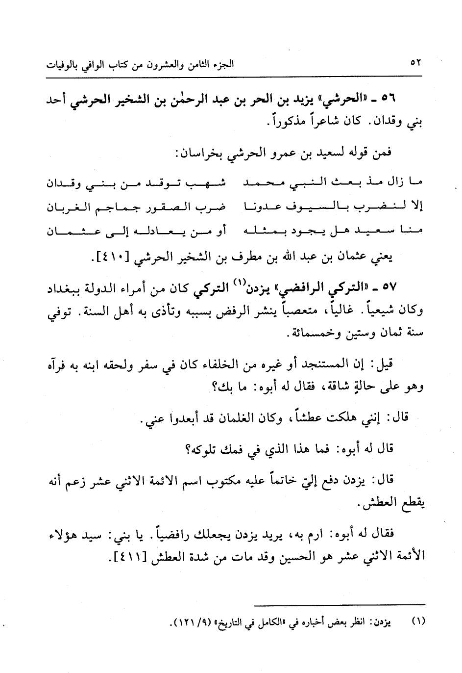 57 - التركي الرافضي يزدن التركي كَانَ من أُمَرَاء الدولة بِبَغْدَاد وَكَانَ شِيعِيًّا غاليا متعصبا ينشر الرَّفْض بِسَبَبِهِ وتأذى بِهِ أهل السّنة توفّي سنة ثَمَان وَسِتِّينَ وَخَمْسمِائة