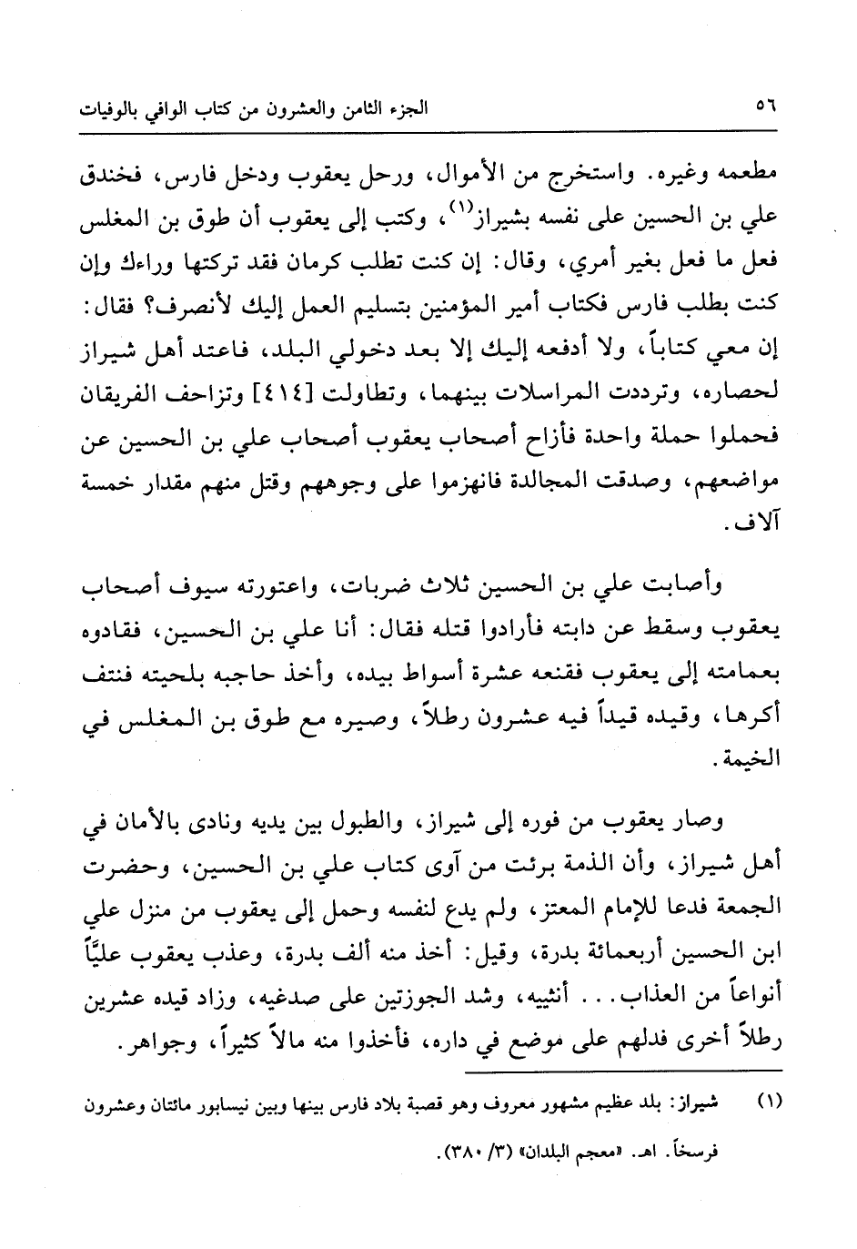 مطعمه وَغَيره واستخرج من الْأَمْوَال ورحل يَعْقُوب وَدخل فَارس فَخَنْدَق عَليّ بن الْحُسَيْن على نَفسه بشيراز وَكتب إِلَى يَعْقُوب أَن طوق بن الْمُغلس فعل مَا فعل بِغَيْر أَمْرِي وَقَالَ إِن كنت تطلب كرمان فقد تركتهَا وَرَاءَك وَإِن كنت بِطَلَب فَارس فكتاب أَمِير الْمُؤمنِينَ بِتَسْلِيم الْعَمَل إِلَيْك لأنصرف فَقَالَ إِن معي كتابا وَلَا أدفعه إِلَيْك إِلَّا بعد دخولي الْبَلَد فاعتد أهل شيراز لحصاره وترددت المراسلات بَينهمَا وتطاولت [414] وتزاحف الْفَرِيقَانِ فحملوا حَملَة وَاحِدَة فأزاح أَصْحَاب يَعْقُوب أَصْحَاب عَليّ بن الْحُسَيْن عَن مواضعهم وصدقت المجالدة فَانْهَزَمُوا على وُجُوههم وَقتل مِنْهُم مِقْدَار خَمْسَة آلَاف