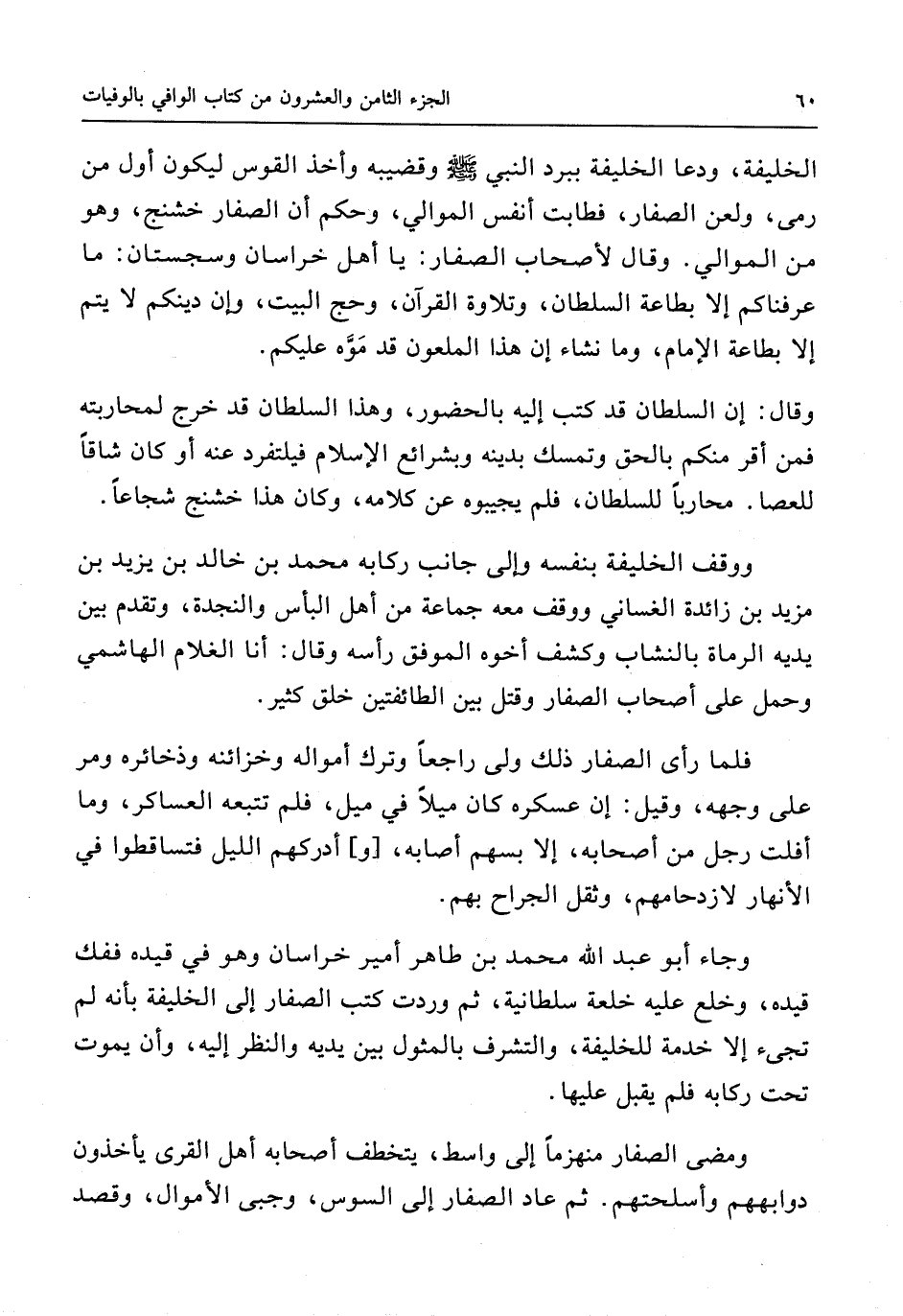 الْخَلِيفَة ودعا الْخَلِيفَة بِبرد النَّبِي صلى الله عَلَيْهِ وَسلم وقضيبه وَأخذ الْقوس ليَكُون أول من رمى وَلعن الصفار فطابت أنفس الموَالِي وَحكم أَن الصفار خشنج وَهُوَ من الموَالِي وَقَالَ لأَصْحَاب الصفار يَا أهل الصفار يَا أهل خُرَاسَان وسجستان مَا عرفناكم إِلَّا بِطَاعَة السُّلْطَان وتلاوة الْقُرْآن وَحج الْبَيْت وَإِن دينكُمْ لَا يتم إِلَّا بِطَاعَة الإِمَام وَمَا نشَاء إِن هَذَا المعلون قد موه عَلَيْكُم