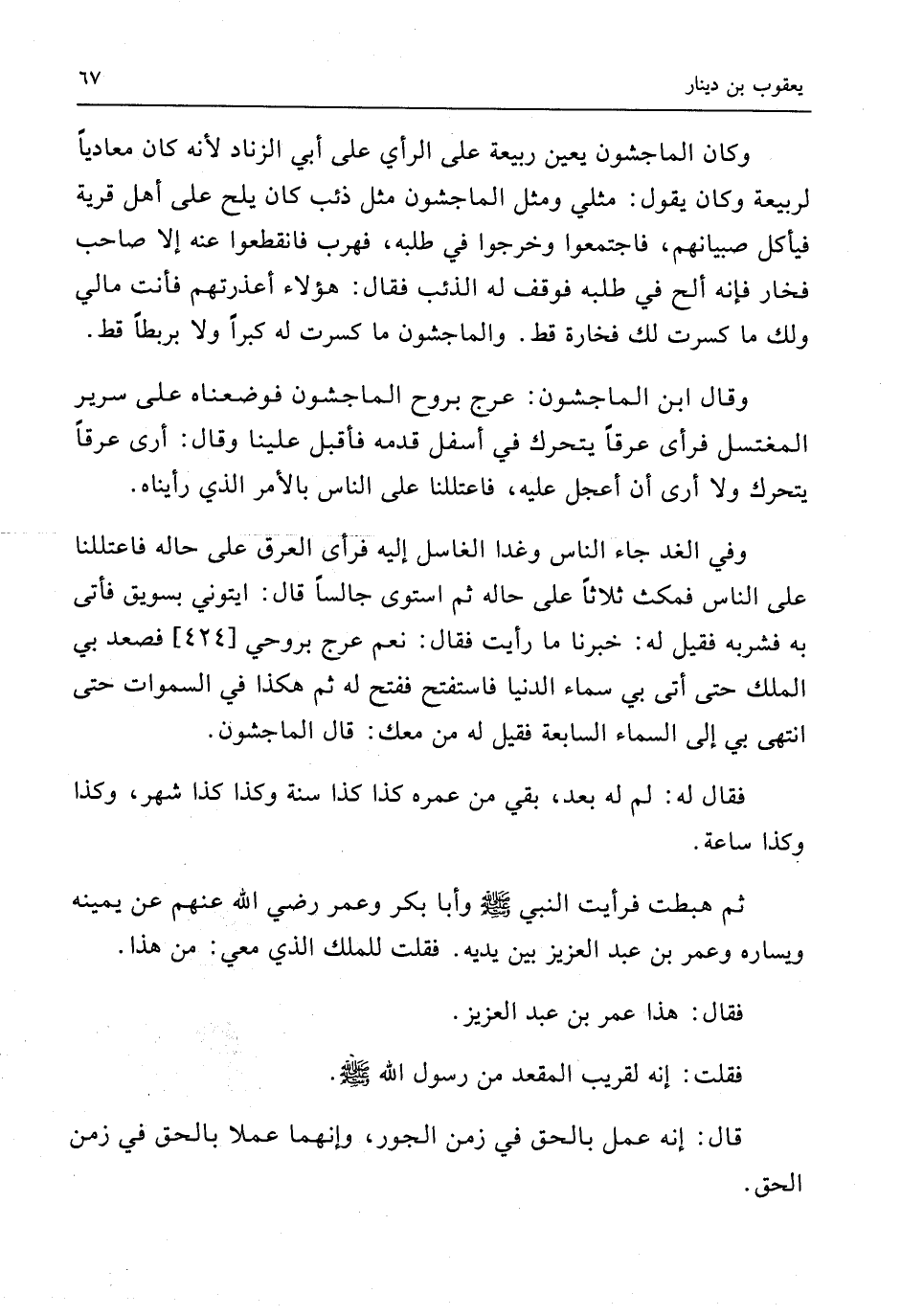 وَفِي الْغَد جَاءَ النَّاس وَغدا الْغَاسِل إِلَيْهِ فَرَأى الْعرق على حَاله فاعتللنا على النَّاس فَمَكثَ ثَلَاثًا على حَاله ثمَّ اسْتَوَى جَالِسا قَالَ ايتوني بسويق فَأتى بِهِ فشربه فَقيل لَهُ خبرنَا مَا رَأَيْت فَقَالَ نعم عرج بروحي [424] فَصَعدَ بِي الْملك حَتَّى أَتَى بِي سَمَاء الدُّنْيَا فَاسْتَفْتَحَ فَفتح لَهُ ثمَّ هَكَذَا فِي السَّمَوَات حَتَّى انْتهى بِي إِلَى السَّمَاء السَّابِعَة فَقيل لَهُ من مَعَك قَالَ الْمَاجشون