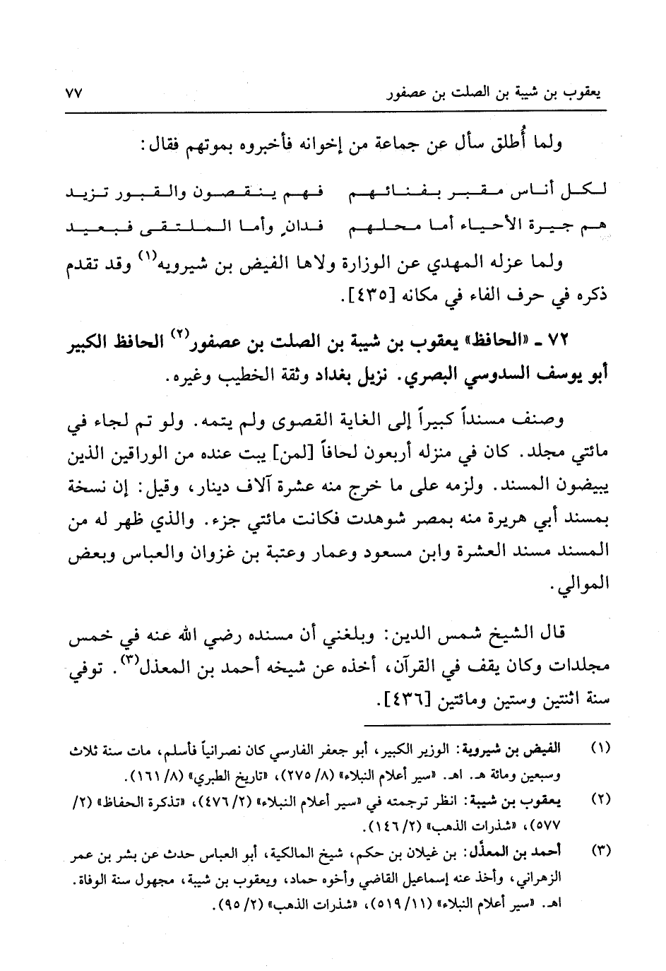 72 - الْحَافِظ يَعْقُوب بن شيبَة بن الصَّلْت بن عُصْفُور الْحَافِظ الْكَبِير أَبُو يُوسُف السدُوسِي الْبَصْرِيّ نزيل بَغْدَاد وثقة الْخَطِيب وَغَيره