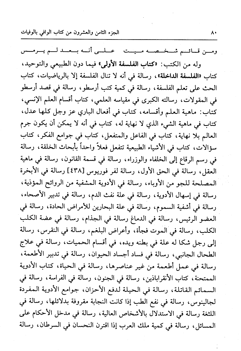 وَله من الْكتب كتاب الفلسفة الأولى فِيمَا دون الطبيعي والتوحيد كتاب الفلسفة الدَّاخِلَة رِسَالَة فِي أَنه لَا تنَال الفلسفة إِلَّا بالرياضيات كتاب الْحَث على تعلم الفلسفة رِسَالَة فِي كمية كتب أرسطو رِسَالَة فِي قصد أرسطو فِي المقولات رسَالَته الْكُبْرَى فِي مقياسه العلمي كتاب أَقسَام الْعلم الْإِنْسِي كتاب مَاهِيَّة الْعلم وأقسامه كتاب فِي أَفعَال الْبَارِي عز وَجل كلهَا عدل كتاب فِي مَاهِيَّة الشَّيْء الَّذِي لَا نِهَايَة لَهُ كتاب فِي أَنه لَا يُمكن أَن يكون جرم الْعَالم بِلَا نِهَايَة كتاب فِي الْفَاعِل والمتفعل كتاب فِي جَوَامِع الْفِكر كتاب سُؤَالَات كتاب فِي الْأَشْيَاء الطبيعية تتفعل فعلا وَاحِدًا بأبحاث الْخلقَة رِسَالَة فِي رسم الرّقاع إِلَى الخلافاء والوزراء رِسَالَة فِي قسْمَة القانون رِسَالَة فِي مَاهِيَّة الْعقل رِسَالَة فِي الْحق الأول رِسَالَة لفر فوريوس [438] رِسَالَة فِي الأبخرة الْمصلحَة للجو من الأوباء رِسَالَة فِي الْأَدْوِيَة المشفية من الروائح المؤذية رِسَالَة فِي إسهال الْأَدْوِيَة رِسَالَة فِي عِلّة نفث الدَّم رِسَالَة فِي تَدْبِير الأصحاء رِسَالَة فِي أشفية السمُوم رِسَالَة فِي عِلّة البحارين للأمراض الحادة رِسَالَة فِي الْعُضْو الرئيس رِسَالَة فِي الدِّمَاغ رِسَالَة فِي الجذام رِسَالَة فِي عضة الْكَلْب الْكَلْب رِسَالَة فِي الْمَوْت فَجْأَة وأعراض البلغم رِسَالَة فِي النقرس رِسَالَة إِلَى رجل شكا لَهُ عِلّة فِي بَطْنه وَيَده فِي أَقسَام الحميات رِسَالَة فِي علاج الطحال الجانبي رِسَالَة فِي فَسَاد أجساد الْحَيَوَان رِسَالَة فِي تَدْبِير الْأَطْعِمَة رِسَالَة فِي عمل أَطْعِمَة من غير عناصرها رِسَالَة فِي الْحَيَاة كتاب الْأَدْوِيَة الممتحنة كتاب الأنقراباذين رِسَالَة فِي الْجُنُون رِسَالَة فِي الفراسة رِسَالَة فِي السمائم القاتلة رِسَالَة فِي الْحِيلَة لدفع الأحزان جَوَامِع الْأَدْوِيَة المفردة لِجَالِينُوسَ رِسَالَة فِي نفع الطِّبّ إِذا كَانَت النجابة مقروفة بدلائها رِسَالَة فِي اللثغة رِسَالَة فِي الِاسْتِدْلَال بالأشخاص الْعَالِيَة رِسَالَة فِي مدْخل الْأَحْكَام على الْمسَائِل رِسَالَة فِي كمية ملك الْعَرَب إِذا اقْترن النحسان فِي السرطان رِسَالَة