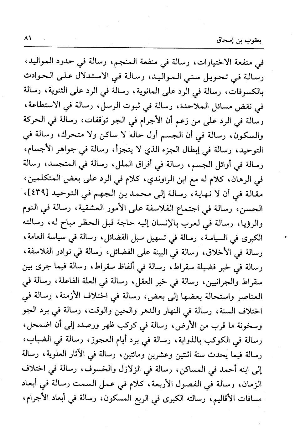 فِي مَنْفَعَة الاختيارات رِسَالَة فِي مَنْفَعَة المنجم رِسَالَة فِي حُدُود المواليد رِسَالَة فِي تَحْويل سني المواليد رِسَالَة فِي الِاسْتِدْلَال على الْحَوَادِث بالكسوفات رِسَالَة فِي الرَّد على المانوية رِسَالَة فِي الرَّد على الثنوية رِسَالَة فِي نقض مسَائِل الْمَلَاحِدَة رِسَالَة فِي ثُبُوت الرُّسُل رِسَالَة فِي الِاسْتِطَاعَة رِسَالَة فِي الرَّد على من زعم أَن الأجرام فِي الجو توقفات رِسَالَة فِي الْحَرَكَة والسكون رِسَالَة فِي أَن الْجِسْم أول حَاله لَا سَاكن وَلَا متحرك رِسَالَة فِي التَّوْحِيد رِسَالَة فِي إبِْطَال الْجُزْء الَّذِي لَا يتَجَزَّأ رِسَالَة فِي جَوَاهِر الْأَجْسَام رِسَالَة فِي أَوَائِل الْجِسْم رِسَالَة فِي أفراق الْملَل رِسَالَة فِي المتجسد رِسَالَة فِي الرِّهَان كَلَام لَهُ مَعَ ابْن الراوندي كَلَام فِي الرَّد على بعض الْمُتَكَلِّمين مقَالَة فِي أَن لَا نِهَايَة رِسَالَة إِلَى مُحَمَّد بن الجهم فِي التَّوْحِيد [439] الْحسن رِسَالَة فِي اجْتِمَاع الفلاسفة على الْأُمُور العشقية رِسَالَة فِي النّوم والرؤيا رِسَالَة فِي لعرب بالإنسان إِلَيْهِ حَاجَة قبل الْحَظْر مُبَاح لَهُ رسَالَته الْكُبْرَى فِي السياسة رِسَالَة فِي تسهيل سبل الْفَضَائِل رِسَالَة فِي سياسة الْعَامَّة رِسَالَة فِي الْأَخْلَاق رِسَالَة فِي الْبَيِّنَة على الْفَضَائِل رِسَالَة فِي نَوَادِر الفلاسفة رِسَالَة فِي خبر فَضِيلَة سقراط رِسَالَة فِي أَلْفَاظ سقراط رِسَالَة فِيمَا جرى بَين سقراط والجرانيين رِسَالَة فِي خبر الْعقل رِسَالَة فِي الْعلَّة الفاعلة رِسَالَة فِي العناصر واستحالة بَعْضهَا إِلَى بعض رِسَالَة فِي اخْتِلَاف الْأَزْمِنَة رِسَالَة فِي اخْتِلَاف السّنة رِسَالَة فِي النَّهَار والدهر والحين وَالْوَقْت رِسَالَة فِي برد الجو وسخونة مَا قرب من الأَرْض رِسَالَة فِي كَوْكَب ظهر ورصده إِلَى أَن اضمحل رِسَالَة فِي الْكَوْكَب بالذوابة رِسَالَة فِي برد أَيَّام الْعَجُوز رِسَالَة فِي الضباب رِسَالَة فِيمَا يحدث سنة اثْنَتَيْنِ وَعشْرين وَمِائَتَيْنِ رِسَالَة فِي الْآثَار العلوية رِسَالَة إِلَى ابْنه أَحْمد فِي المساكن رِسَالَة فِي الزلازل والخسوف رِسَالَة فِي اخْتِلَاف الزَّمَان رِسَالَة فِي الْفُصُول الْأَرْبَعَة كَلَام فِي عمل السمت رِسَالَة فِي أبعاد مسافات الأقاليم رسَالَته الْكُبْرَى فِي الرّبع المسكون رِسَالَة فِي أبعاد الأجرام