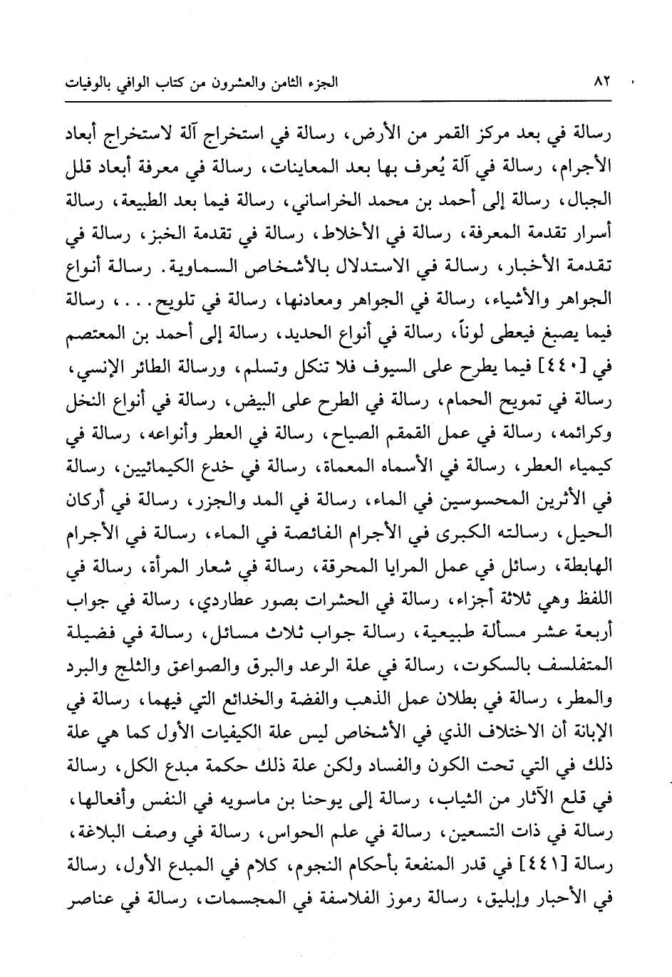 رِسَالَة فِي بعد مَرْكَز الْقَمَر من الأَرْض رِسَالَة فِي اسْتِخْرَاج آلَة لاستخراج أبعاد الأجرام رِسَالَة فِي آلَة يعرف بهَا بعد المعاينات رِسَالَة فِي معرفَة أبعاد قلل الْجبَال رِسَالَة إِلَى أَحْمد بن مُحَمَّد الْخُرَاسَانِي رِسَالَة فِيمَا بعد الطبيعة رِسَالَة أسرار تقدمة الْمعرفَة رِسَالَة فِي الأخلاط رِسَالَة فِي تقدمة الْخبز رِسَالَة فِي تقدمة الْأَخْبَار رِسَالَة فِي الِاسْتِدْلَال بالأشخاص السماوية رِسَالَة أَنْوَاع الْجَوَاهِر والأشياء رِسَالَة فِي الْجَوَاهِر ومعادنها رِسَالَة فِي تلويح رِسَالَة فِيمَا يصْبغ فَيعْطى لونا رِسَالَة فِي أَنْوَاع الْحَدِيد رِسَالَة إِلَى أَحْمد بن المعتصم فِي [440] فِيمَا يطْرَح على السيوف فَلَا تنكل وتسلم ورسالة الطَّائِر الْإِنْسِي رِسَالَة فِي تمويح الْحمام رِسَالَة فِي الطرح على الْبيض رِسَالَة فِي أَنْوَاع النّخل وكرائمه رِسَالَة فِي عمل القمقم الصياح رِسَالَة فِي الْعطر وأنواعه رِسَالَة فِي كيمياء الْعطر رِسَالَة فِي الأسماه المعماة رِسَالَة فِي خدع الكيمائيين رِسَالَة فِي الأثرين المحسوسين فِي المَاء رِسَالَة فِي الْمَدّ والجزر رِسَالَة فِي أَرْكَان الْحِيَل رسَالَته الْكُبْرَى فِي الأجرام الفائصة فِي المَاء رِسَالَة فِي الأجرام الهابطة رسائل فِي عمل المرايا المحرقة رِسَالَة فِي شعار الْمَرْأَة رِسَالَة فِي اللَّفْظ وَهِي ثَلَاثَة أَجزَاء رِسَالَة فِي الحشرات بصور عطاردي رِسَالَة فِي جَوَاب أَرْبَعَة عشر مَسْأَلَة طبيعية رِسَالَة جَوَاب ثَلَاث مسَائِل رِسَالَة فِي فَضِيلَة المتفلسف بِالسُّكُوتِ رِسَالَة فِي عِلّة الرَّعْد والبرق وَالصَّوَاعِق والثلج وَالْبرد والمطر رِسَالَة فِي بطلَان عمل الذَّهَب والفضلة الخدائع الَّتِي فيهمَا رِسَالَة فِي الْإِبَانَة أَن الِاخْتِلَاف الَّذِي فِي الْأَشْخَاص لَيْسَ عِلّة الكيفيات الأول كَمَا هِيَ عِلّة ذَلِك فِي الَّتِي تَحت الْكَوْن وَالْفساد وَلنْ عِلّة ذَلِك حِكْمَة مبدع الْكل رِسَالَة فِي قلع الْآثَار من الثِّيَاب رِسَالَة إِلَى يوحنا بن ماسويه فِي النَّفس وأفعالها رِسَالَة فِي ذَات التسعين رِسَالَة فِي علم الْحَواس رِسَالَة فِي وصف البلاغة رِسَالَة [441] فِي قدر الْمَنْفَعَة بِأَحْكَام النُّجُوم كَلَام فِي الْمُبْدع الأول رِسَالَة فِي الْأَحْبَار وإبليق رِسَالَة رموز الفلاسفة فِي المجسمات رِسَالَة فِي عناصر