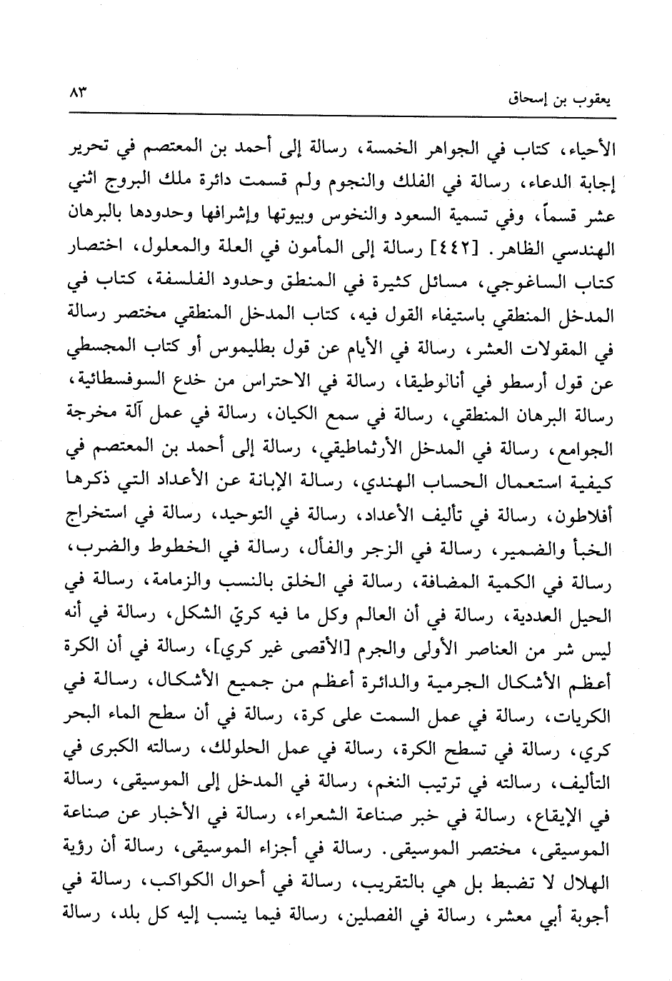 الْأَحْيَاء كتاب فِي الْجَوَاهِر الْخَمْسَة رِسَالَة إِلَى أَحْمد بن المعتصم فِي تَحْرِير إِجَابَة الدُّعَاء رِسَالَة فِي الْفلك والنجوم وَلم قسمت دَائِرَة ملك البروج اثْنَي عشر قسما وَفِي تَسْمِيَة السُّعُود والنخوس وبيوتها وإشرافها وحدودها بالبرهان الهندسي الظَّاهِر [442] رِسَالَة إِلَى الْمَأْمُون فِي الْعلَّة والمعلول اخْتِصَار كتاب الساغوجي مسَائِل كَثِيرَة فِي الْمنطق وحدود الفلسفة كتاب فِي الْمدْخل المنطقي بِاسْتِيفَاء القَوْل فِيهِ كتاب الْمدْخل المنطقي مُخْتَصر رِسَالَة فِي المقولات الْعشْر رِسَالَة فِي الْأَيَّام عَن قَول بطليموس أَو كتاب المجسطي عَن قَول أرسطو فِي أنالوطيقا رِسَالَة فِي الاحتراس من خدع السوفسطائية رِسَالَة الْبُرْهَان المنطقي رِسَالَة فِي سمع الكيان رِسَالَة فِي عمل آلَة مخرجة الْجَوَامِع رِسَالَة فِي الْمدْخل الأرثماطيقي رِسَالَة إِلَى أَحْمد بن المعتصم فِي كَيْفيَّة اسْتِعْمَال الْحساب الْهِنْدِيّ رِسَالَة الْإِبَانَة عَن الْأَعْدَاد الَّتِي ذكرهَا أفلاطون رِسَالَة فِي تأليف الْأَعْدَاد رِسَالَة فِي التَّوْحِيد رِسَالَة فِي اسْتِخْرَاج الخبأ وَالضَّمِير رِسَالَة فِي الزّجر والفأل رِسَالَة فِي الخطوط وَالضَّرْب رِسَالَة فِي الكمية المضافة رِسَالَة فِي الْخلق بِالنّسَبِ والزمامة رِسَالَة فِي الْحِيَل العددية رِسَالَة فِي أَن الْعَالم وكل مَا فِيهِ كري الشكل رِسَالَة فِي أَنه لَيْسَ شَرّ من العناصر الأولى والجرم الْأَقْصَى غير كري رِسَالَة فِي أَن الكرة أعظم الأشكال الجرمية والدائرة أعظم من جَمِيع الأشكال رِسَالَة فِي الكريات رِسَالَة فِي عمل السمت على كرة رِسَالَة فِي أَن سطح المَاء الْبَحْر كري رِسَالَة فِي تسطح الكرة رِسَالَة فِي عمل الحلولك رسَالَته الْكُبْرَى فِي التَّأْلِيف رسَالَته فِي تَرْتِيب النغم رِسَالَة فِي الْمدْخل إِلَى الموسيقى رِسَالَة فِي الْإِيقَاع رِسَالَة فِي خبر صناعَة الشُّعَرَاء رِسَالَة فِي الْأَخْبَار عَن صناعَة الموسيقى مُخْتَصر الموسيقى رِسَالَة فِي أَجزَاء الموسيقى رِسَالَة أَن رُؤْيَة الْهلَال لَا تضبط بل هِيَ بالتقريب رِسَالَة فِي أَحْوَال الْكَوَاكِب رِسَالَة فِي أجوبة أبي معشر رِسَالَة فِي الْفَصْلَيْنِ رِسَالَة فِيمَا ينْسب إِلَيْهِ كل بلد رِسَالَة