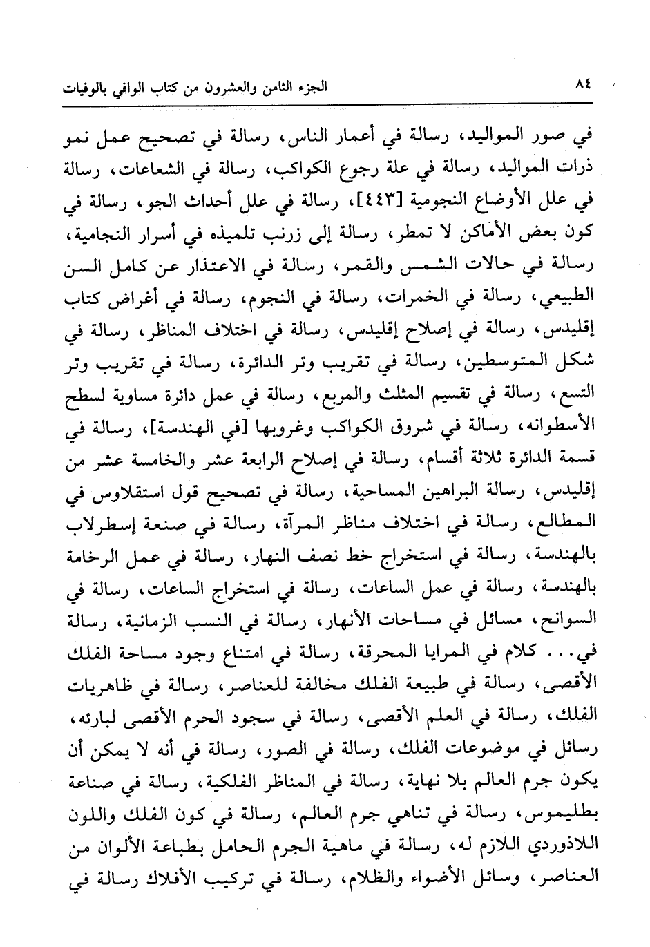 فِي صور المواليد رِسَالَة فِي أَعمار النَّاس رِسَالَة فِي تَصْحِيح عمل نمو ذرات المواليد رِسَالَة فِي عِلّة رُجُوع الْكَوَاكِب رِسَالَة فِي الشعاعات رِسَالَة فِي علل الأوضاع النجومية [443] رِسَالَة فِي علل أَحْدَاث الجو رِسَالَة فِي كَون بعض الْأَمَاكِن لَا تمطر رِسَالَة إِلَى زرنب تِلْمِيذه فِي أسرار النجامية رِسَالَة فِي حالات الشَّمْس وَالْقَمَر رِسَالَة فِي الِاعْتِذَار عَن كَامِل السن الطبيعي رِسَالَة فِي الخمرات رِسَالَة فِي النُّجُوم رِسَالَة فِي أغراض كتاب إقليدس رِسَالَة فِي إصْلَاح إقليدس رِسَالَة فِي اخْتِلَاف المناظر رِسَالَة فِي شكل المتوسطين رِسَالَة فِي تقريب وتر الدائرة رِسَالَة فِي تقريب وتر التسع رِسَالَة فِي تَقْسِيم المثلث والمربع رِسَالَة فِي عمل دَائِرَة مُسَاوِيَة لسطح الأسطوانه رِسَالَة فِي شروق الْكَوَاكِب وغروبها فِي الهندسة رِسَالَة فِي قسْمَة الدائرة ثَلَاثَة أَقسَام رِسَالَة فِي إصْلَاح الرَّابِعَة عشر وَالْخَامِسَة عشر من إقليدس رِسَالَة الْبَرَاهِين المساحية رِسَالَة فِي تَصْحِيح قَول استقلاوس فِي الْمطَالع رِسَالَة فِي اخْتِلَاف مناظر الْمرْآة رِسَالَة فِي صَنْعَة إسطرلاب بالهندسة رِسَالَة فِي اسْتِخْرَاج خطّ نصف النَّهَار رِسَالَة فِي عمل الرخامة بالهندسة رِسَالَة فِي عمل السَّاعَات رِسَالَة فِي اسْتِخْرَاج السَّاعَات رِسَالَة فِي السوانح مسَائِل فِي مساحات الْأَنْهَار رِسَالَة فِي النّسَب الزمانية رِسَالَة فِي كَلَام فِي المرايا المحرقة رِسَالَة فِي امْتنَاع وجود مساحة الْفلك الْأَقْصَى رِسَالَة فِي طبيعة الْفلك مُخَالفَة للعناصر رِسَالَة فِي ظاهريات الْفلك رِسَالَة فِي الْعلم الْأَقْصَى رِسَالَة فِي سُجُود الْحرم الْأَقْصَى لبارئه رسائل فِي مَوْضُوعَات الْفلك رِسَالَة فِي الصُّور رِسَالَة فِي أَنه لَا يُمكن أَن يكون جرم الْعَالم بِلَا نِهَايَة رِسَالَة فِي المناظر الفلكية رِسَالَة فِي صناعَة بطليموس رِسَالَة فِي تناهي جرم الْعَالم رِسَالَة فِي كَون الْفلك واللون اللاذوردي اللَّازِم لَهُ رِسَالَة فِي مَاهِيَّة الجرم الْحَامِل بطباعة الألوان من العناصر وَسَائِل الأضواء والظلام رِسَالَة فِي تركيب الأفلاك رِسَالَة فِي
