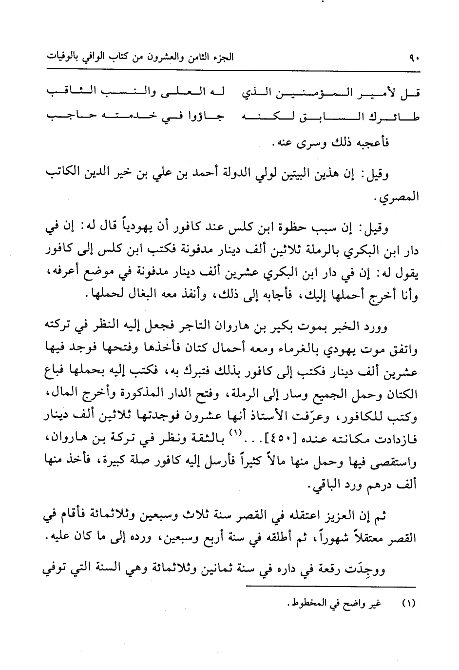 وَورد الْخَبَر بِمَوْت بكير بن هاروان التَّاجِر فَجعل إِلَيْهِ النّظر فِي تركته وَاتفقَ موت يَهُودِيّ بالغرماء وَمَعَهُ أحمال كتَّان فَأَخذهَا وَفتحهَا فَوجدَ فِيهَا عشْرين ألف دِينَار فَكتب إِلَى كافور بذلك فتبرك بِهِ فَكتب إِلَيْهِ بحملها فَبَاعَ الْكَتَّان وَحمل الْجَمِيع وَسَار إِلَى الرملة وفتحالدار الْمَذْكُورَة وَأخرج المَال وَكتب للكافور وَعرفت الْأُسْتَاذ أَنَّهَا عشرُون فَوَجَدتهَا ثَلَاثِينَ ألف دِينَار فازدادت مكانته عِنْده [450] بالثقة وَنظر فِي تَرِكَة بن هاروان واستقصى فِيهَا وَحمل مِنْهَا مَالا كثيرا فَأرْسل إِلَيْهِ كافور صلَة كَبِيرَة فَأخذ مِنْهَا ألف دِرْهَم ورد الْبَاقِي