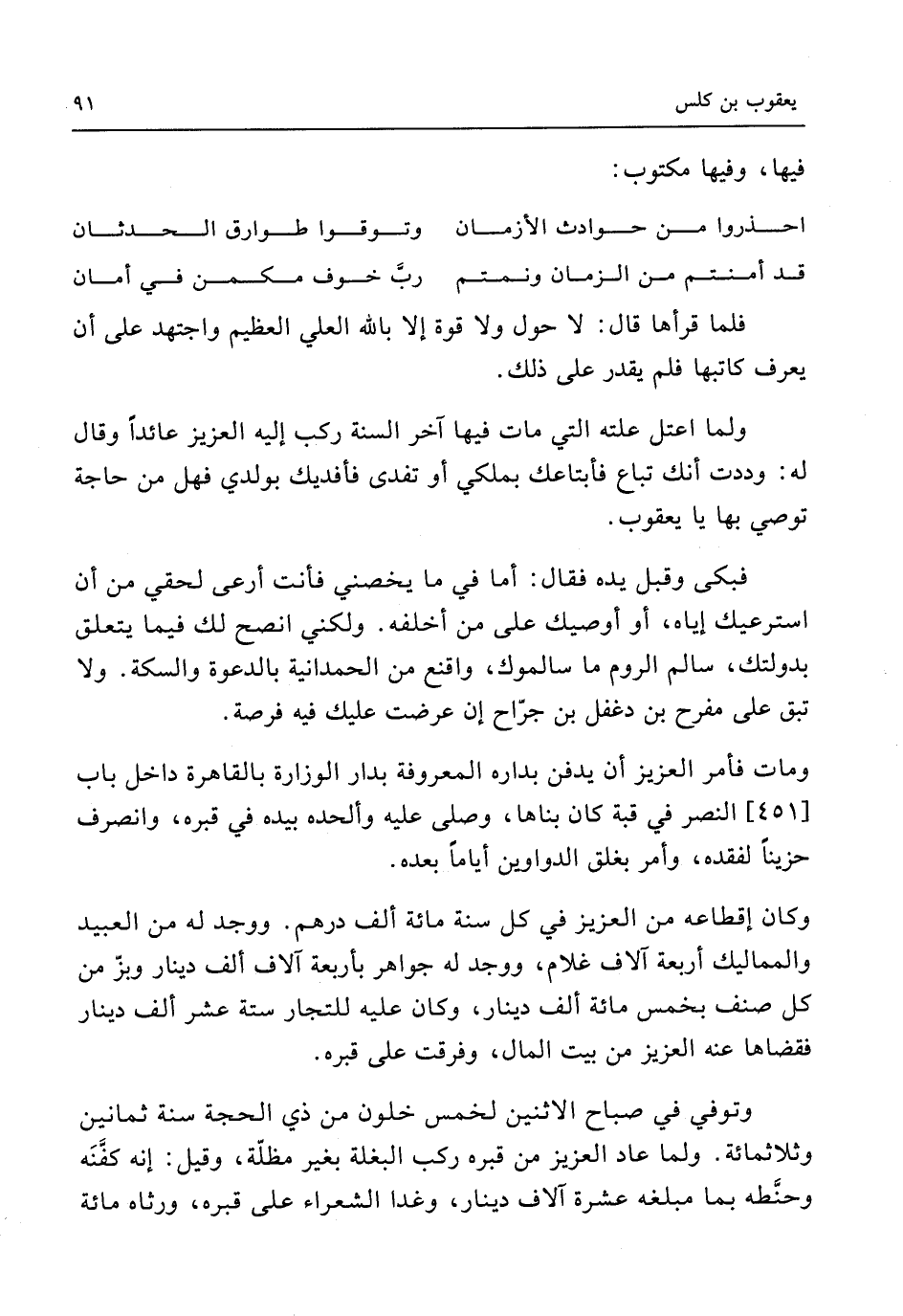 فَبكى وَقبل يَده فَقَالَ أما فِي مَا يخصني فَأَنت أرعى لحقي من أَن استرعيك إِيَّاه أَو أوصيك على مَا أخلفه وَلَكِنِّي أنصح لَك فِيمَا يتَعَلَّق بدولتك سَالم الرّوم أَو سالموك واقنع من الحمدانية بالدعوة وَالسِّكَّة وَلَا تبْق على مفرح بن دَغْفَل بن جراح إِن عرضت عَلَيْك فِيهِ فرْصَة