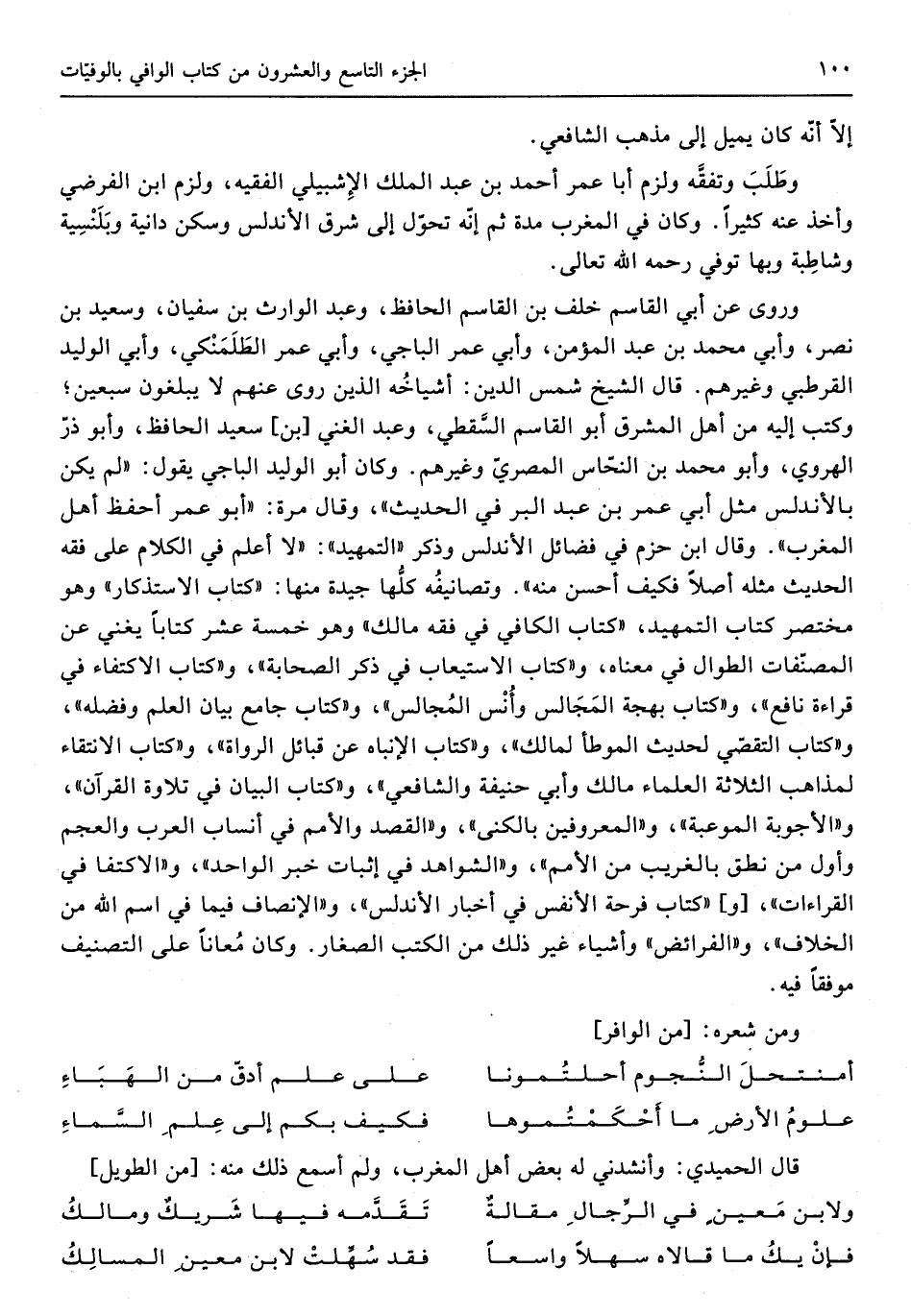 وروى عَن أبي الْقَاسِم خلف بن الْقَاسِم الْحَافِظ وَعبد الْوَارِث بن سُفْيَان وَسَعِيد بن نصر وَأبي مُحَمَّد بن عبد الْمُؤمن وَأبي عمر الْبَاجِيّ وَأبي عمر الطلمنكي وَأبي الْوَلِيد الْقُرْطُبِيّ وَغَيرهم قَالَ الشَّيْخ شمس الدّين أشياخه الَّذين روى عَنْهُم لَا يبلغون سبعين وَكتب إِلَيْهِ من أهل الْمشرق أَبُو الْقَاسِم السَّقطِي وَعبد الْغَنِيّ بن سعيد الْحَافِظ وَأَبُو ذَر الْهَرَوِيّ وَأَبُو مُحَمَّد بن النّحاس الْمصْرِيّ وَغَيرهم وَكَانَ أَبُو الْوَلِيد الْبَاجِيّ يَقُول لم يكن بالأندلس مثل أبي عمر بن عبد الْبر فِي الحَدِيث وَقَالَ مرّة أَبُو عمر أحفظ أهل الْمغرب وَقَالَ ابْن حزم فِي فَضَائِل الأندلس وَذكر التَّمْهِيد لَا أعلم فِي الْكَلَام على فقه الحَدِيث مثله أصلا فَكيف أحسن مِنْهُ وتصانيفه كلهَا جَيِّدَة مِنْهَا كتاب الاستذكار وَهُوَ مُخْتَصر كتاب التَّمْهِيد كتاب الْكَافِي فِي فقه مَالك وَهُوَ خَمْسَة عشر كتابا يُغني عَن المصنفات الطوَال فِي مَعْنَاهُ وَكتاب الِاسْتِيعَاب فِي ذكر الصَّحَابَة وَكتاب الِاكْتِفَاء فِي قِرَاءَة نَافِع وَكتاب بهجة الْمجَالِس وَأنس الْمجَالِس وَكتاب جَامع بَيَان الْعلم وفضله وَكتاب التَّقَصِّي لحَدِيث الْمُوَطَّأ لمَالِك وَكتاب الإنباه عَن قبائل الروَاة وَكتاب الانتقاء لمذاهب الثَّلَاثَة الْعلمَاء مَالك وَأبي حنيفَة وَالشَّافِعِيّ وَكتاب الْبَيَان فِي تِلَاوَة الْقُرْآن والأجوبة الموعبة والمعروفين بالكنى وَالْقَصْد والأمم فِي أَنْسَاب الْعَرَب والعجم وَأول من نطق بالغريب من الْأُمَم والشواهد فِي إِثْبَات خبر الْوَاحِد والاكتفا فِي الْقرَاءَات وَكتاب فرحة الْأَنْفس فِي أَخْبَار الأندلس والإنصاف فِيمَا فِي اسْم الله من الْخلاف والفرائض وَأَشْيَاء غير ذَلِك من الْكتب الصغار وَكَانَ معانا على التصنيف موفقا فِيهِ
