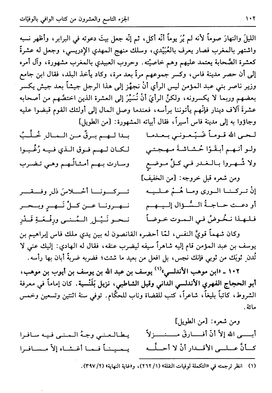 102 - ابْن موهب الأندلسي يُوسُف بن عبد الله بن يُوسُف بن أَيُّوب بن موهب أَبُو الْحجَّاج الفِهري الأندلسي الداني وَقيل الشاطبي نزيل بلنسية كَانَ إِمَامًا فِي معرفَة الشُّرُوط كَاتبا بليغا شَاعِرًا كتب للقضاة وناب للحكام توفّي سنة اثْنَتَيْنِ وَتِسْعين وَخمْس مائَة