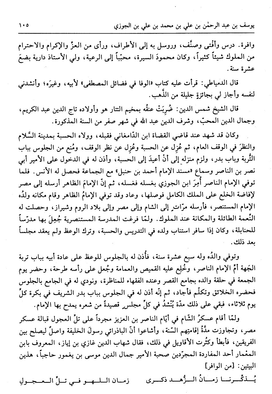 وَتُوفِّي وَالِده وَله سبع عشرَة سنة فَأذن لَهُ بِالْجُلُوسِ للوعظ على عَادَة أَبِيه بِبَاب تربة الْجِهَة أم الإِمَام النَّاصِر وخلع عَلَيْهِ الْقَمِيص والعمامة وَجعل على رَأسه طرحة وَحضر يَوْم الْجُمُعَة فِي حَلقَة وَالِده بِجَامِع الْقصر وَعِنْده الْفُقَهَاء للمناظرة وَنُودِيَ لَهُ فِي الْجَامِع بِالْجُلُوسِ فحضره الْخَلَائق وَتكلم فأجاد ثمَّ إِنَّه أذن لَهُ فِي الْجُلُوس بِبَاب بدر الشريف فِي بكرَة كل يَوْم ثلاثاء فَبَقيَ على ذَلِك مُدَّة ينشد فِي كل مجْلِس قصيدة من شعره يمدح بهَا الإِمَام